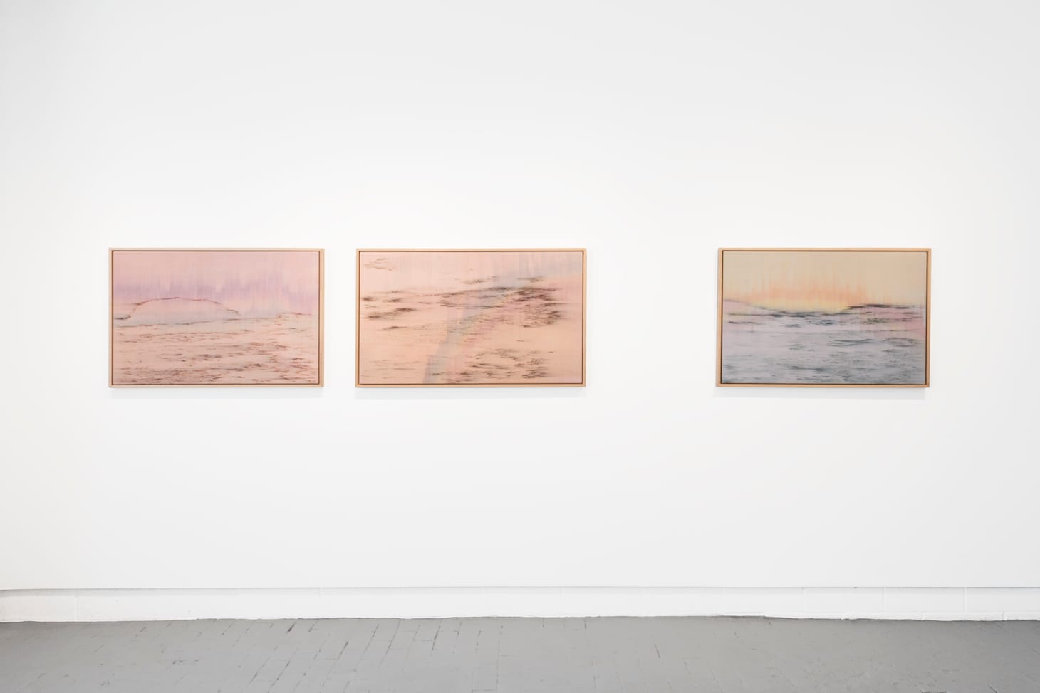 Despite my anxieties about aerosols and anti-maskers, I had come to Abattoir to escape the day-to-day dystopia, or to try to, for an hour. I moved on from the rainbows, drawn by Cleveland-based artist Hildur Ásgeirsdóttir Jónsson, to a series of her textile paintings — ethereal, abstracted landscapes woven from silk thread that Jónsson paints directly. She dyes the warp and weft separately, allowing chance to enter the work when the two come together, alternately creating saturation and diffusion.