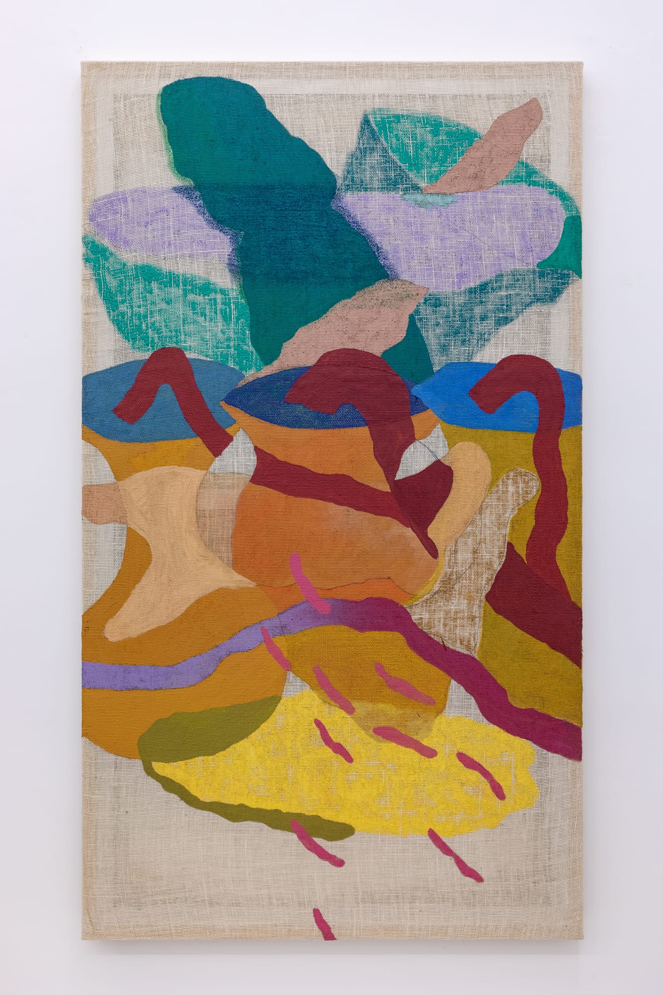Where Jónsson brings warp and weft into harmony, New York-based artist Kaveri Raina applies paint to both sides of coarse burlap, smearing and caking the paint with a pressure that pushes the fibers apart. In the standout work of the show, “Dodo’s Assortment” (2019), some of the paint ekes through to the front, while other passages remain pure shadow, suggesting something lurking beneath the surface. Raina’s palette of jewel tones and ocher conveys warmth and pleasantness, but the work ultimately subverts the decorative, as fleshy shapes intersect with bits of still life, hinting at a Surrealist approach to form and its permeability. (That Abattoir’s first show would invoke Surrealism is apropos, as abattoir is a word I will forever associate with French writer Georges Bataille.)