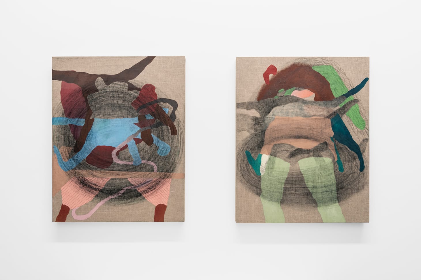 Limbs, torsos, and serpentine squiggles float, collide, and merge into one another across Raina’s compositions. In “Vortex to Hover” and “Hovering Stance” (both 2019), the artist has aggressively drawn swirling vortices in graphite over layered, biomorphic forms. Paired in the gallery’s intimate back room, these works substitute linen for burlap, but the force of the pencil tugging at fabric from all directions has warped the woven grid, creating a subtle sense of vertigo as the drawing pulls you in. At a moment when so many of us are missing physical touch and closeness, the relentless tactility of Raina’s work resonates all the more deeply.