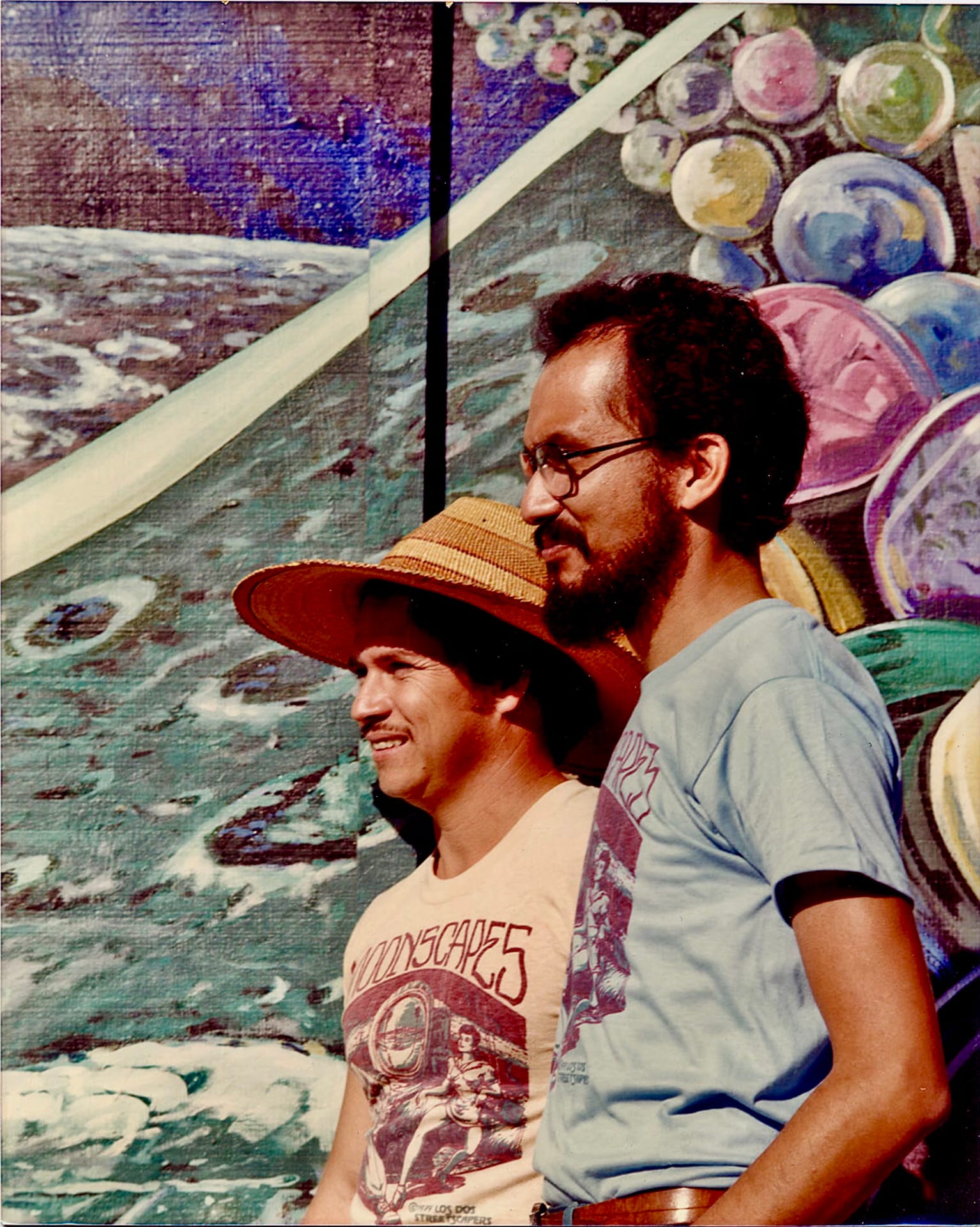 Their proposal for a space-themed exterior mural was accepted, and the pair brought on David’s younger brother Paul who was still in high school, and fellow artist George Yepes, whom David had known since childhood, to assist. Scenes ranged from futuristic vehicles cruising extraterrestrial freeways, Einstein riding a bicycle, astronauts in a lunar rover, and astronomers from different eras and places, “each pointing to the same point in space, each documenting the life of the same star,” Botello said.