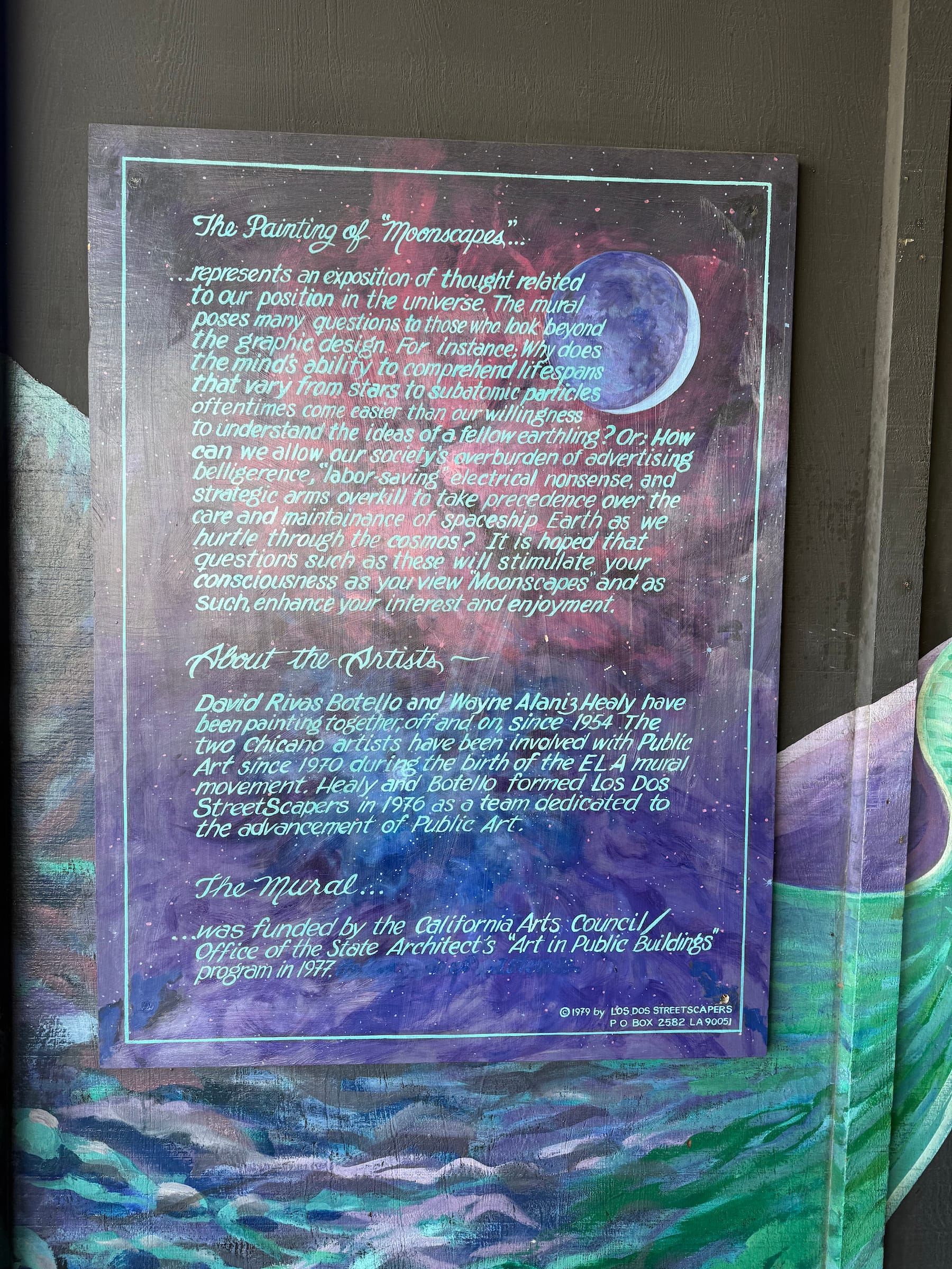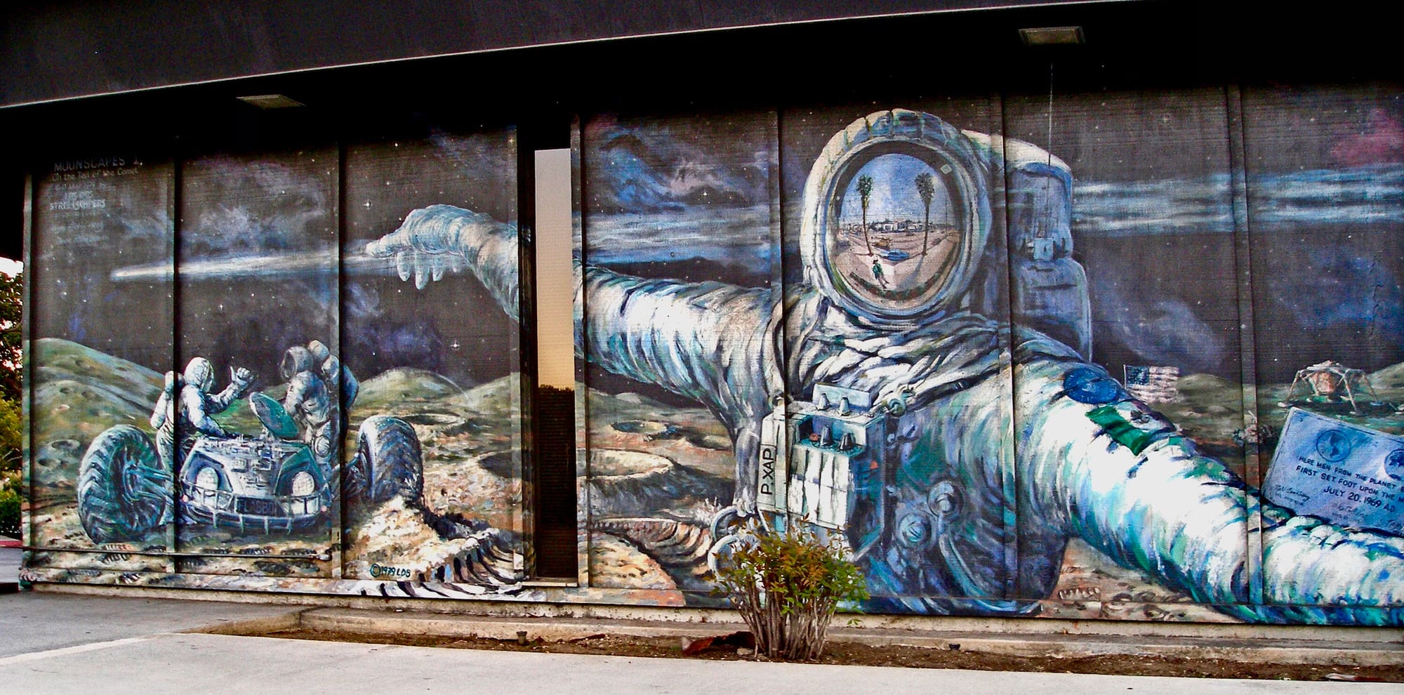 “Moonscapes,” a cosmic tableaux wrapping around all four sides of the the Culver City Department of Motor Vehicles (DMV), depicted Maya astronomers, contemporary astronauts, Albert Einstein, and other scenes related to the study and exploration of space. It was completed in 1979 by David Botello and Wayne Healy with funding from the California Arts Council and Office of the State Architect’s Arts in Public Buildings program.