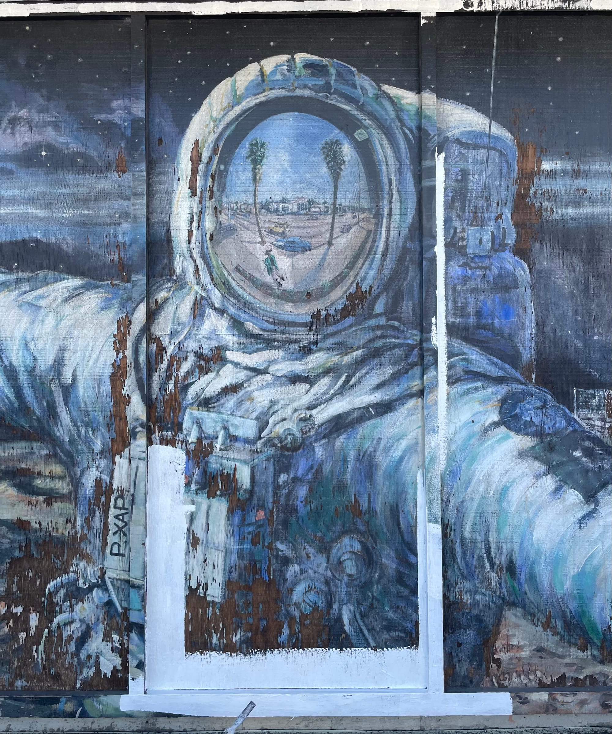 “All of my uncles worked for the aerospace industry, and I remember hearing older people talking about that mural,” Ramos told Hyperallergic. He specifically referenced a large image of an astronaut on the lunar surface, its mirrored helmet reflecting a sunny LA street with cars, palm trees, and a small zoot-suited pachuco figure. “I vividly remember that as a kid," Ramos said. "Almost as a kind of camouflaged reference to the communities there.”