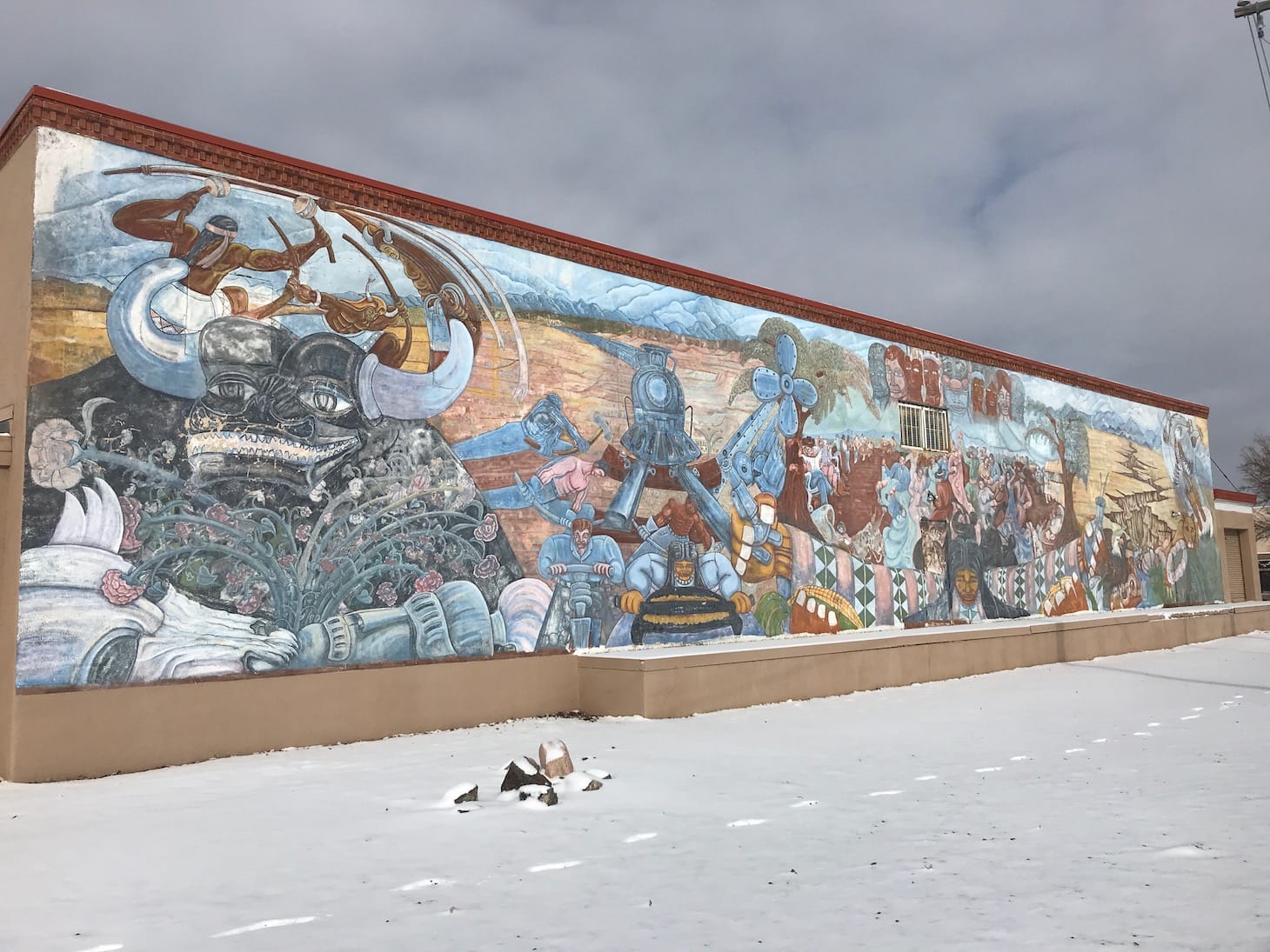 The mural is representative of a time in Santa Fe when muralism was gaining popularity, and in particular was a venue for expression about the complex social makeup of New Mexico. Guzman worked with several artists on the mural, including David Bradley, Cassandra Mains, John Sandford, Rosemary Stearns, Linda Lomahaftewa, Zara Kriegstein, and Frederico Vigil. Tom Romero, president of the board at El Museo Cultural de Santa Fe, told Hyperallergic that “the whole idea was driven by the Chicano movement that was spreading across the country … the work is supportive of the folks and the native peoples, and the mix of cultures.”