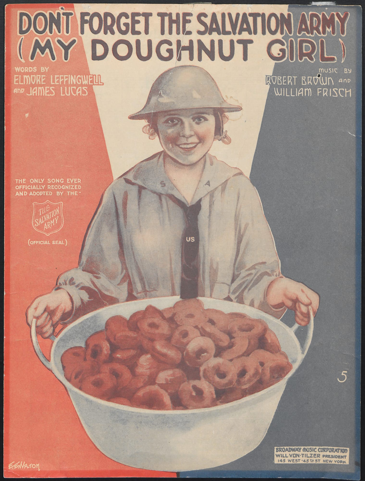 The Donut Lassies even had a musical tribute composed for them -- "Don't Forget The Salvation Army (My Donut Girl)," written in 1919 by Robert Brown, William Frisch, Elmore Leffingwell, and James Lucas. The cover art for the sheet music features a beaming volunteer wearing a hard hat and proudly hoisting a tubful of donuts next to a text that reads, "The only song ever officially recognized and adopted by The Salvation Army."