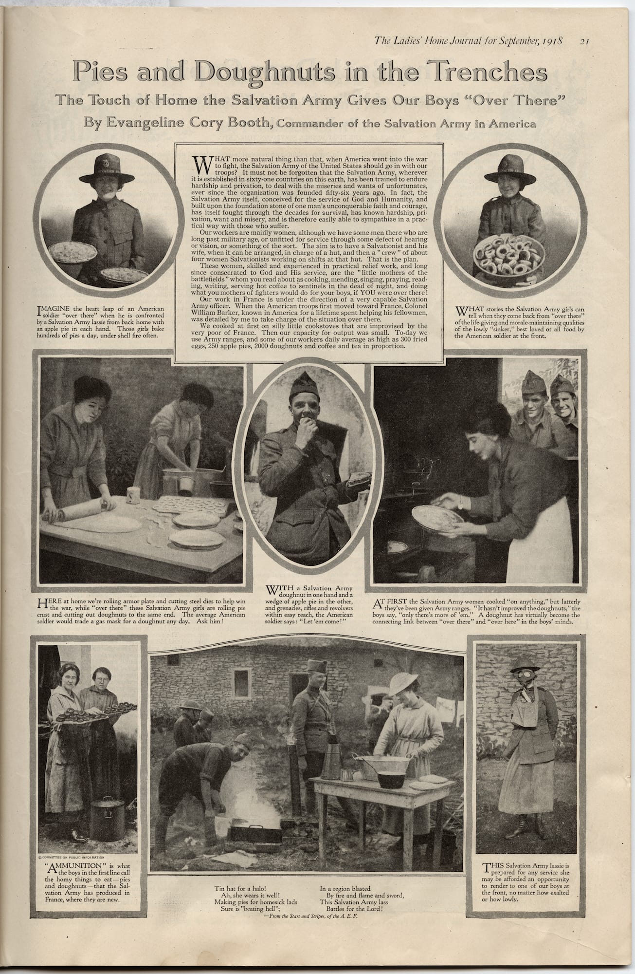 An article in a September 1918 issue of the Ladies’ Home Journal in the museum’s archives describes the Salvation Army’s volunteers, primarily women as young as 16 or 17 years old, as “the little mothers of the battlefields.” At first, they used “silly little cookstoves improvised by the very poor of France,” but as their output increased, they were given Army gas ranges.