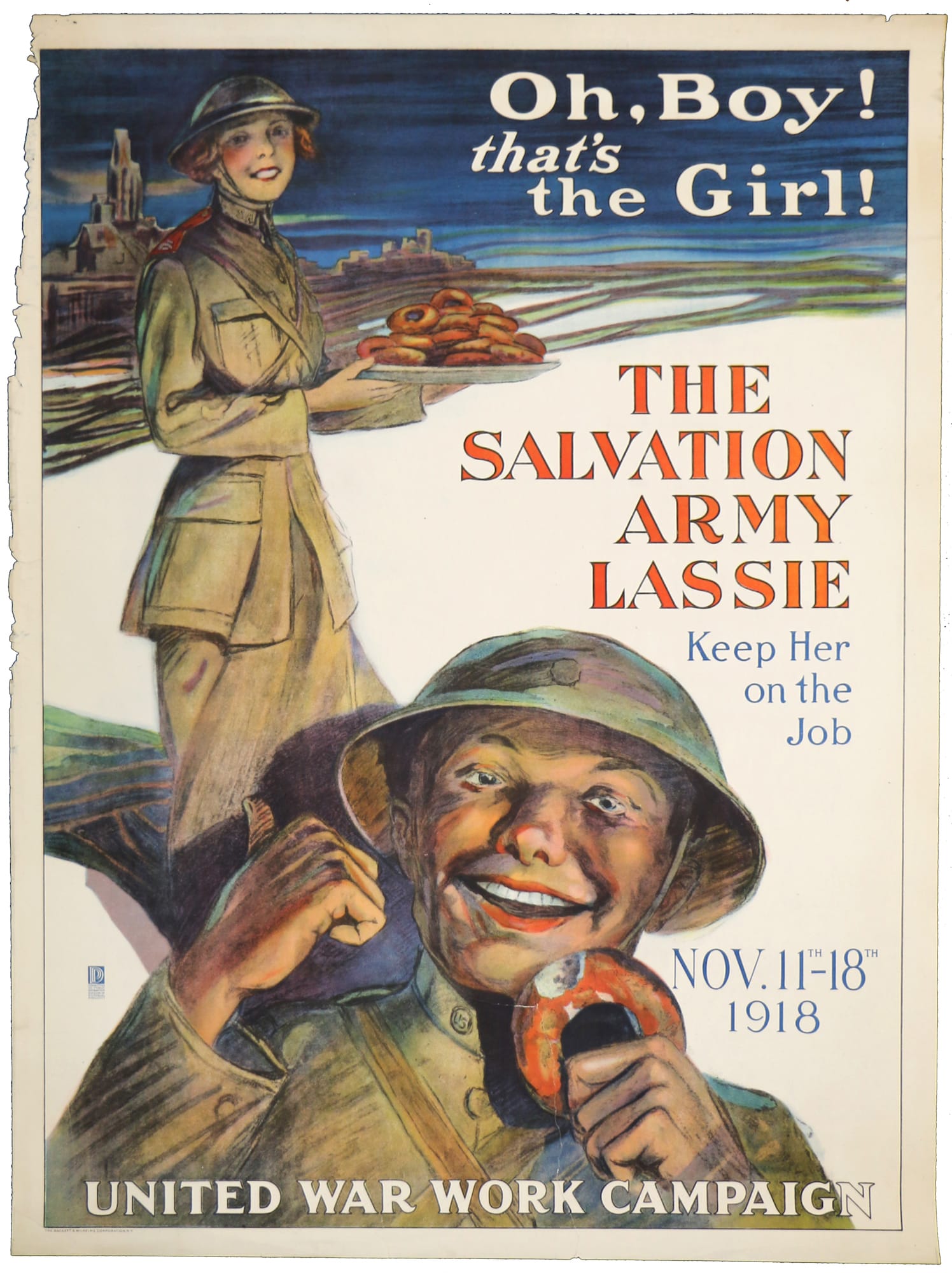 "Possibly the most famous image was of the Salvation Army 'Lassie,'" Doran Cart, Senior Curator at the National WWI Museum, told Hyperallergic. "That poster from the United War Work Campaign fundraiser after the Armistice of November 11, 1918 asked for the women to 'keep on the job' of making doughnuts even after the guns were silenced on the Western Front."