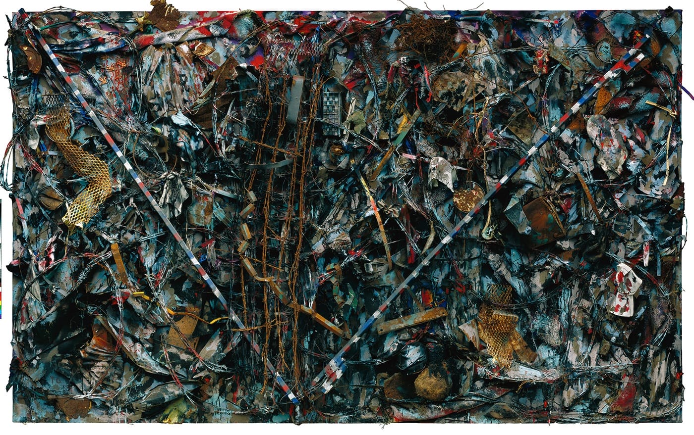 At one end of the exhibition space, visitors will be greeted by a panel displaying “Medallion” (circa 1960), a quilt by Loretta Pettway with patches of multicolored, vertical and horizontal stripes set against a black ground. Those entering the galleries from the opposite door will pass through a room with an Isamu Noguchi sculpture and monumental Clyfford Still paintings before coming upon Dial’s “Victory in Iraq” (2004), a mixed-media tableau featuring painted found materials tucked in and around V-shaped metal rods. Here, Dial, a former welder in a railway-carriage factory, used rusty metal cans, stuffed animals, a mannequin’s head, crumpled steel, and metal mesh to evoke a battlefield’s chaotic atmosphere — and credibly portray a slice of its landscape of destruction. (Nearby looms a Jackson Pollock drip painting whose real and suggested surface textures seem almost subdued in comparison with Dial’s material-capturing tour de force.)
