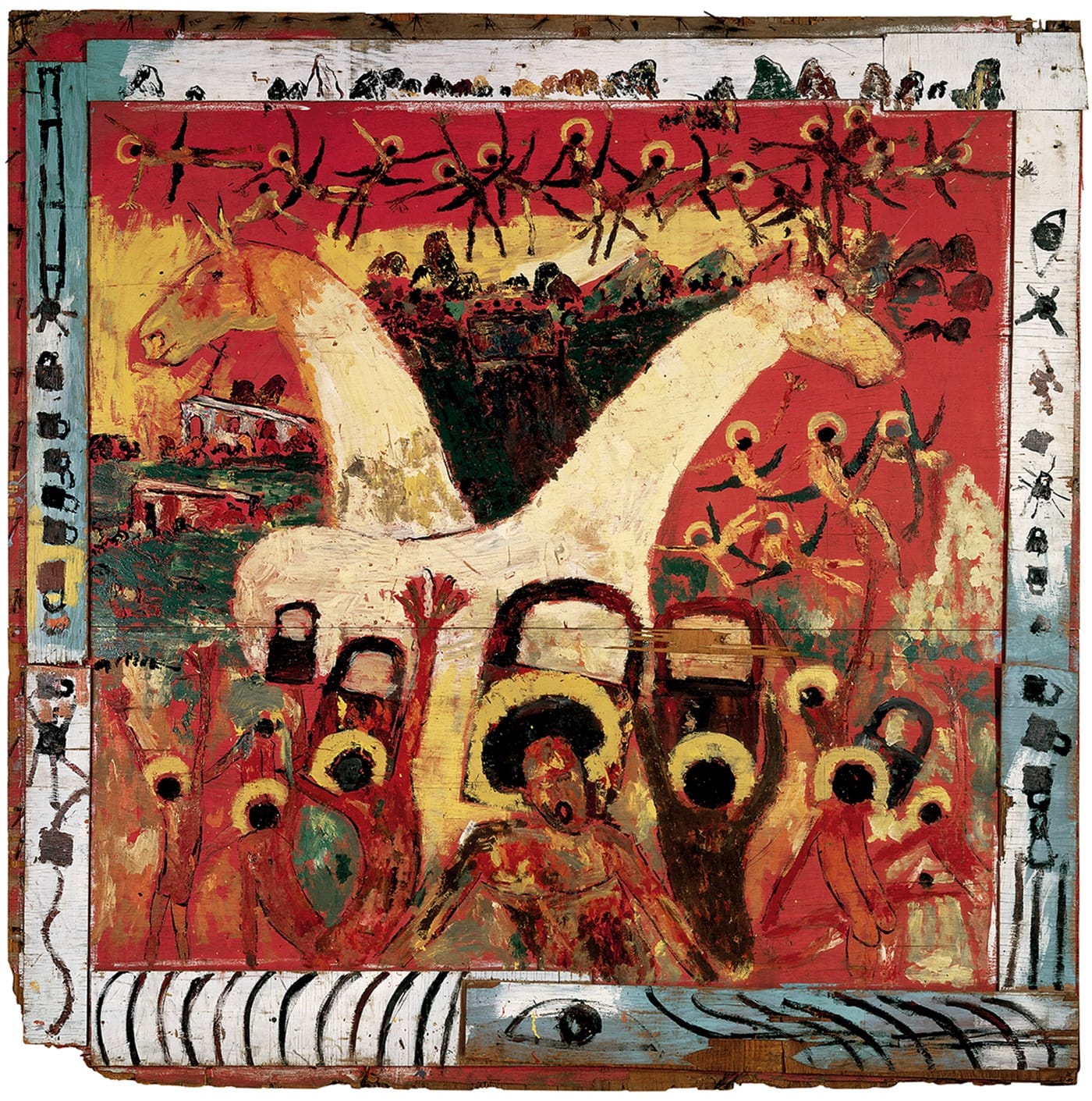 In his art, Dial, who died at his home near Birmingham, Alabama, in early 2016, examined such big subjects as slavery, racism, human rights, war, injustice, and nature’s forces. Despite the hardships and racism he experienced in his own life, his message was one of hope —and of beauty, too. Here, his “History Refused to Die” (2004), a freestanding, mixed-media sculpture whose title neatly summarizes the artist’s worldview, commands a room filled with numerous quilts, as well as such works as Lonnie Holley’s “African Mask” (2003), made with old car tires, electrical outlets, a welder’s mask, and lace; Ronald Lockett’s “The Enemy Amongst Us” (1995), a composition of vertical slats of rusty metal; and Purvis Young’s painting on wood, “Locked Up Their Minds” (1972), depicting a crowd of people rallying around two long-necked horses. Some of Young’s figures carry large padlocks, about which the artist once remarked, “I put locks in some of my paintings. A lot of people are locked up, struggling. The lock is playing a key part. It means mostly something’s wrong.”