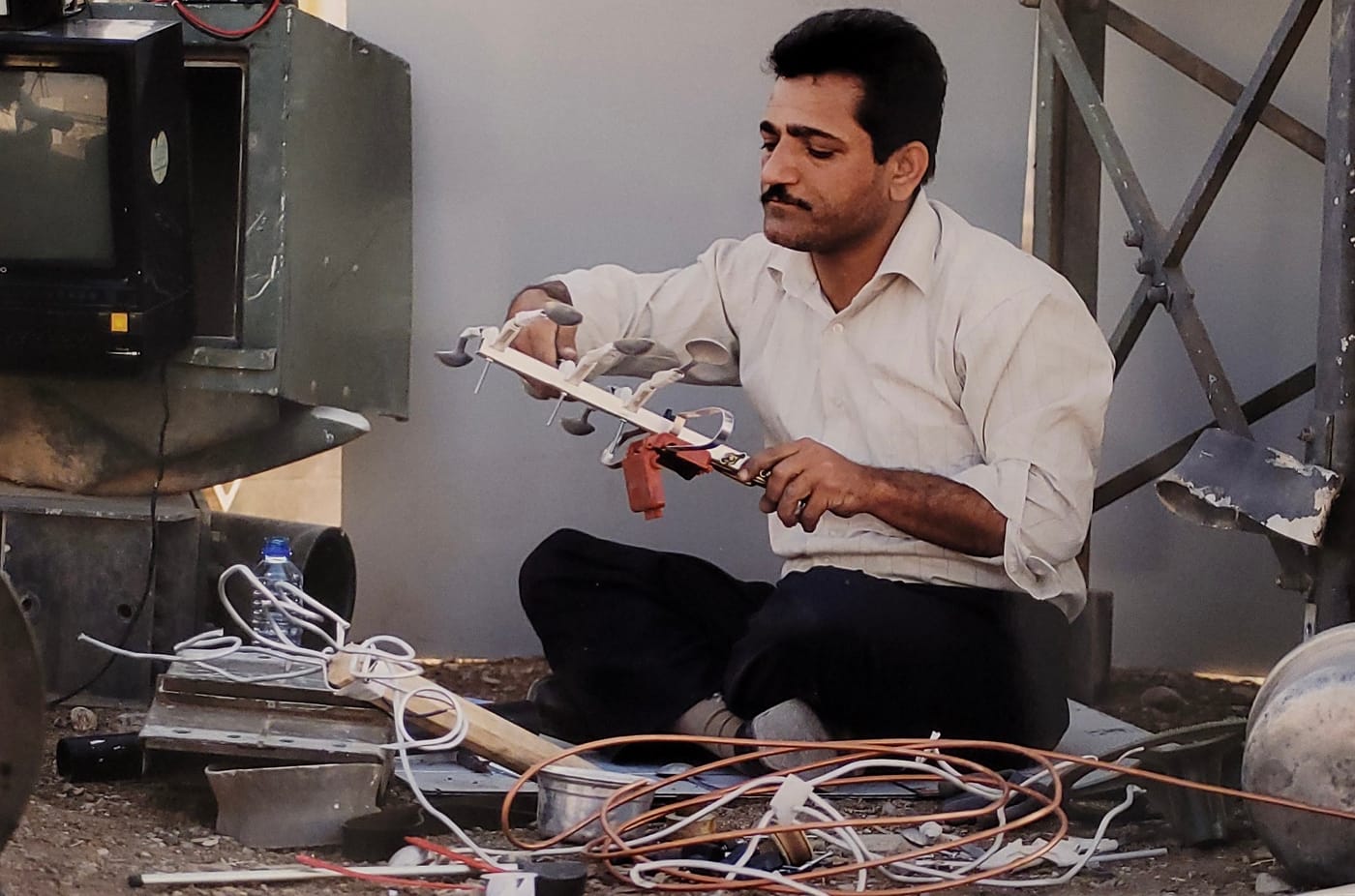 In an adjoining room, "Qatees" (2009) recreates a series of documents and artifacts surrounding Abbas, an electrician and antenna maker who deserted from the Iran-Iraq War. Both sides of the conflict presented their own set of facts on radio broadcasts; from his residence in hiding, Abbas constructed an array of antennae that enabled him to hear news from both sources. Because both sides were only interested in broadcasting their victories, listeners — particularly people trying to find information on relatives who may have been injured, killed, or captured — could only learn the truth by listening to both newsfeeds.