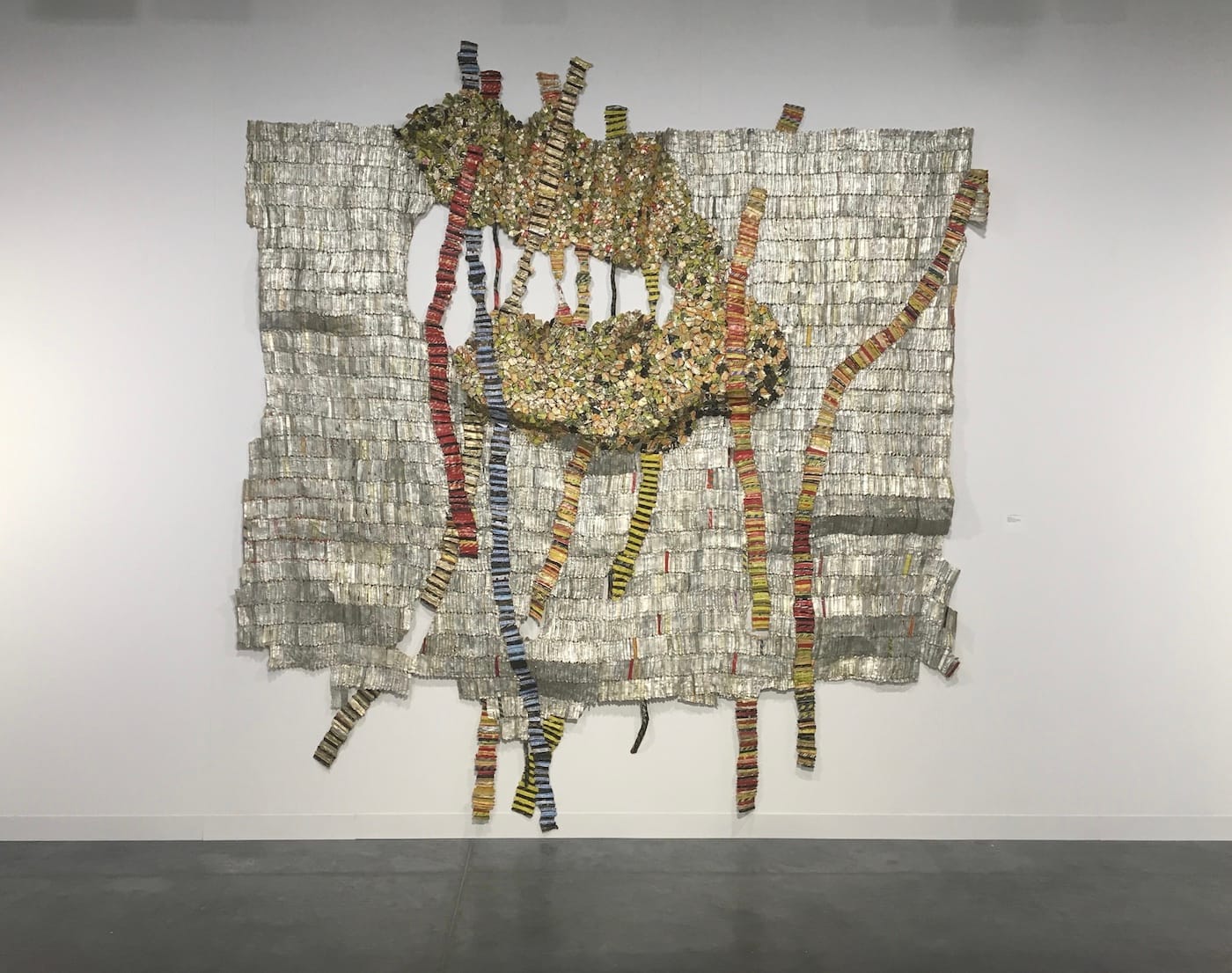 There was a multi-panel work featuring a hot-pink pillow by Robert Rauschenberg (“Rose Pole Spread,” 1978, Galerie Thaddaeus Ropac), which might have looked too sweet anywhere else, but here felt muscular and grounded; a chunky yellow-green sculpture adorned with a pair of earbuds by Rachel Harrison stood out among the fair’s more polite offerings (“MD827ZM/B,” 2016, Greene Naftali) for its herky-jerky, elbows-and-knees movement and look-at-me color; and among the many El Anatsui knock-offs at the various Miami venues, it was thrilling to see the knockout aluminum-and-copper-wire “Shared Roots” (2014, Jack Shainman Gallery), with its ribbons and clouds of red, yellow, blue, and gold against a silvery ground — all made from bits of scrap metal, in accordance with the artist’s longstanding practice.