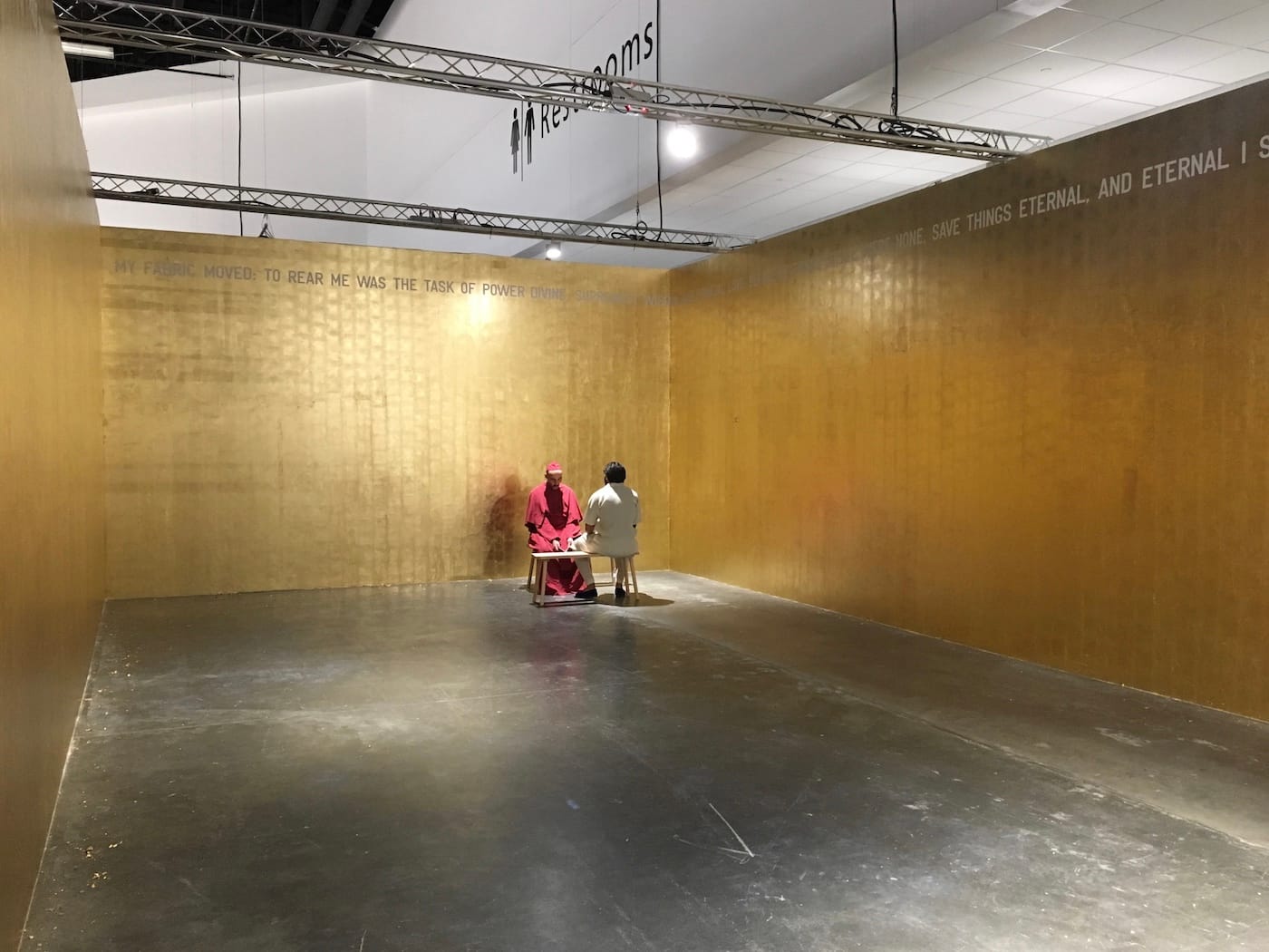 Tiravanija covered the booth’s three sides in gold leaf and inscribed the words from the gate of Dante’s Hell across the top (“Through me you pass / Into the City of Woe / Through me you pass / Into eternal pain,” all the way through “All hope abandon / Ye who enter here”).