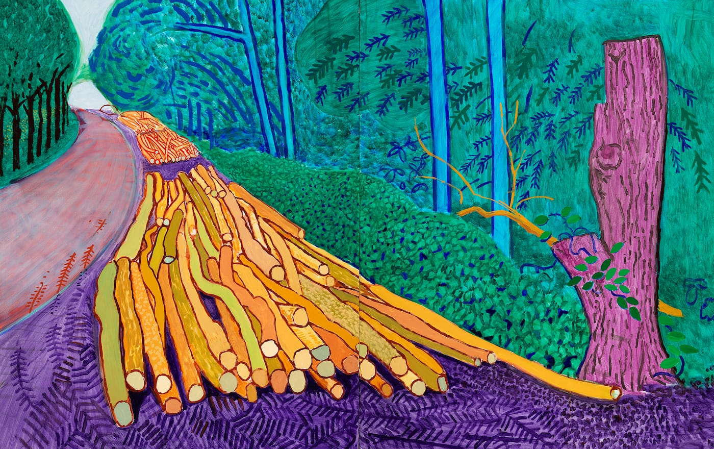 AMSTERDAM — Entering Hockney – Van Gogh: The Joy of Nature at Amsterdam’s Van Gogh Museum is like walking into a painted fantasy forest. Tree trunks are rendered in red, blue, pink, purple, yellow, electric green; leaves are hinted at with quick brushstrokes, or cartoonishly outlined. In the galleries upstairs, we come out of the trees into a countryside idyll, with blue-boundaried fields, waving corn and the occasional electricity pylon or hay wagon.