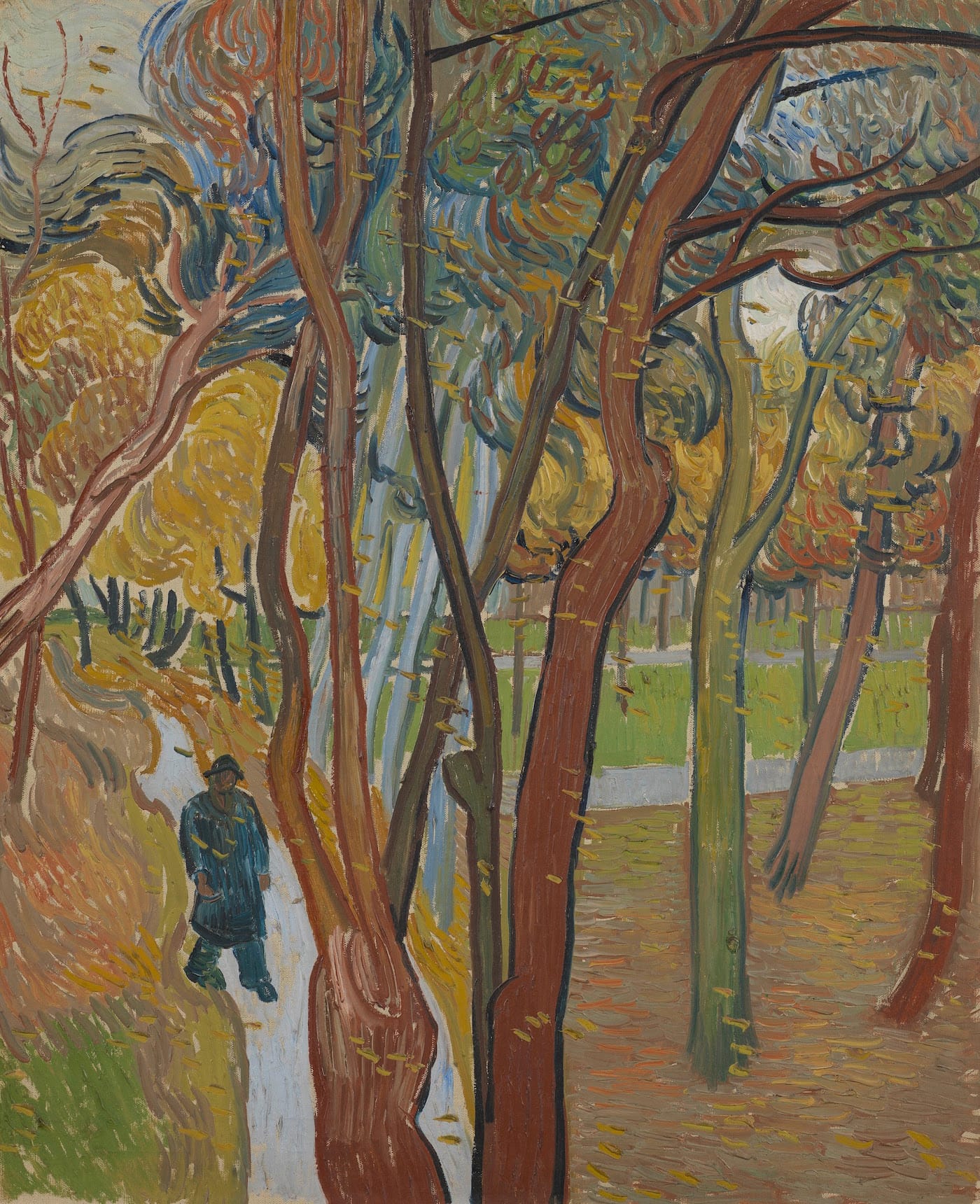 Although van Gogh is an undisputed master of color, his palette is far more muted than Hockney’s almost psychedelic hues. The most striking example can be found in van Gogh’s beautiful 1889 work “The Garden of Saint Paul’s Hospital (‘Leaf-Fall’).” Winding paths and wind-bent trees are depicted in autumnal browns, greens and blues, with dabs of ochre paint capturing the essence of falling leaves. This work was painted when van Gogh had been institutionalized in a secure hospital for mental patients, and there is certainly a feeling of entrapment and confusion at play. Although his painterly style is radically free, the tree trunks that rise up in the foreground are reminiscent of bars at a window, blocking our view of the path, which itself disappears into nothing well before the expected vanishing point: a road to nowhere.