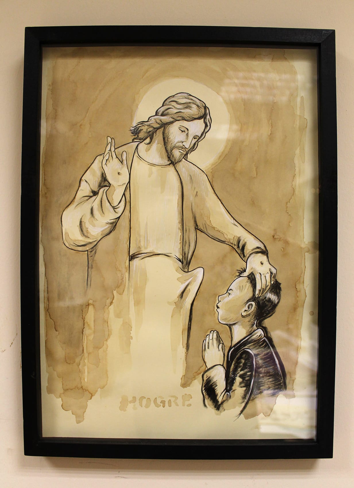 Hogre was one of two artists who, on June 1 of this year, placed satirical posters in bus stop advertising spaces in the Italian capital. Hogre’s poster “Ecce homo erectus” depicts Jesus with a conspicuous erection, resting one hand on the head of a praying, kneeling child. This was a response to sexual abuse charges against Cardinal Pell, the third highest-ranking Vatican official.
