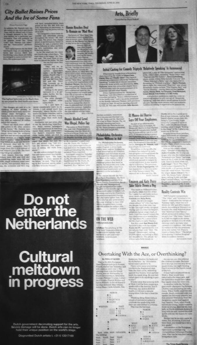 You may have seen it in the New York Times: a half-page ad warning readers “Do not enter the Netherlands. Cultural meltdown in progress.” The ad (which apparently cost $26,000) was bought by a group called Dutch Artists 2011 to protest the catastrophic funding cuts proposed by Holland's Geert Wilder