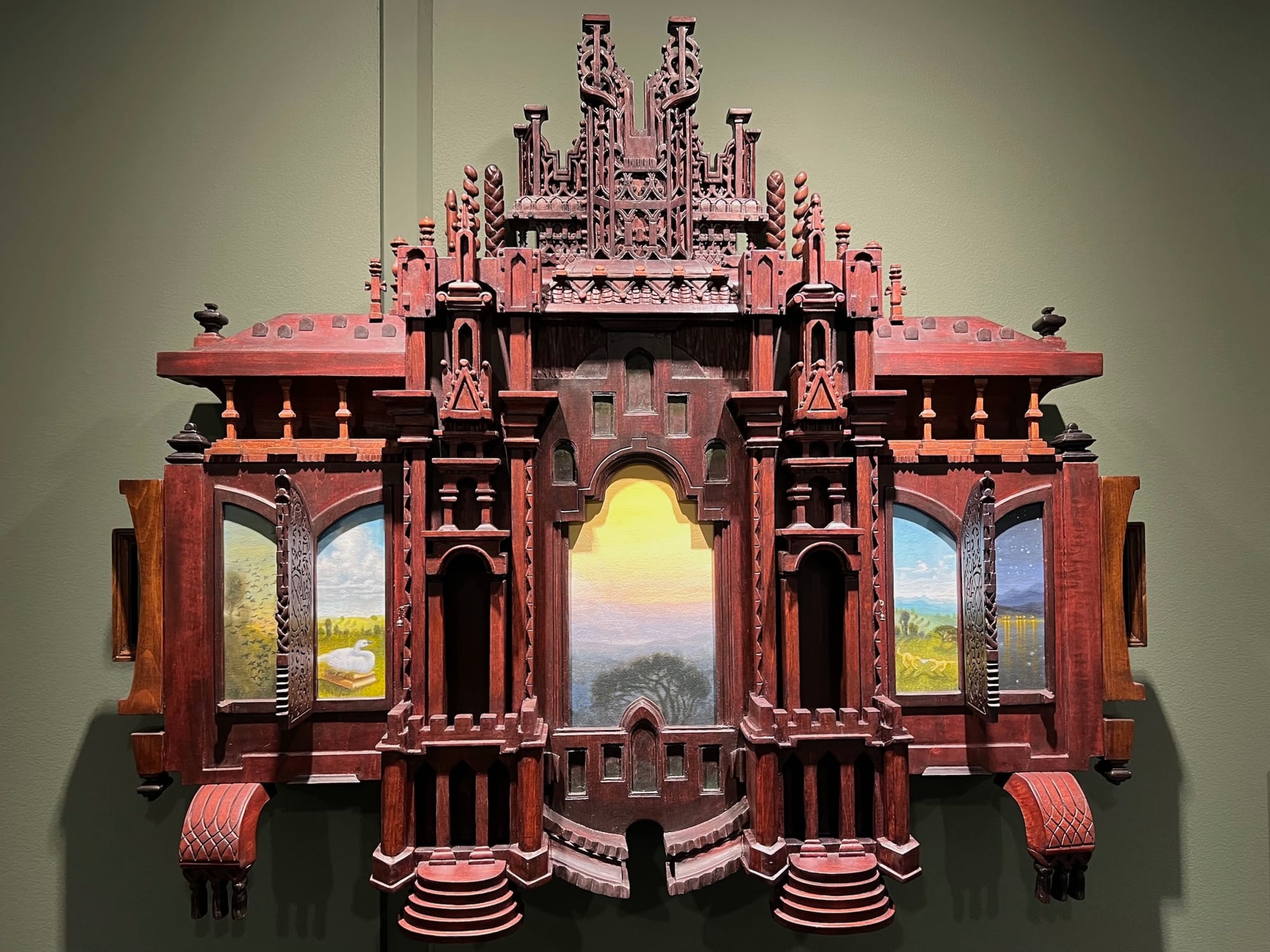 The artist created “After the Storm” (2012), one of the more personal pieces in the show, when a forced move brought her to a new loca tion outside the city. Its intricate crown signals triumph after trouble and the scenes revealed in its side portals — including a starry sky, a duck on books, and two dogs fighting over underwear — add wonderment and gentle humor.