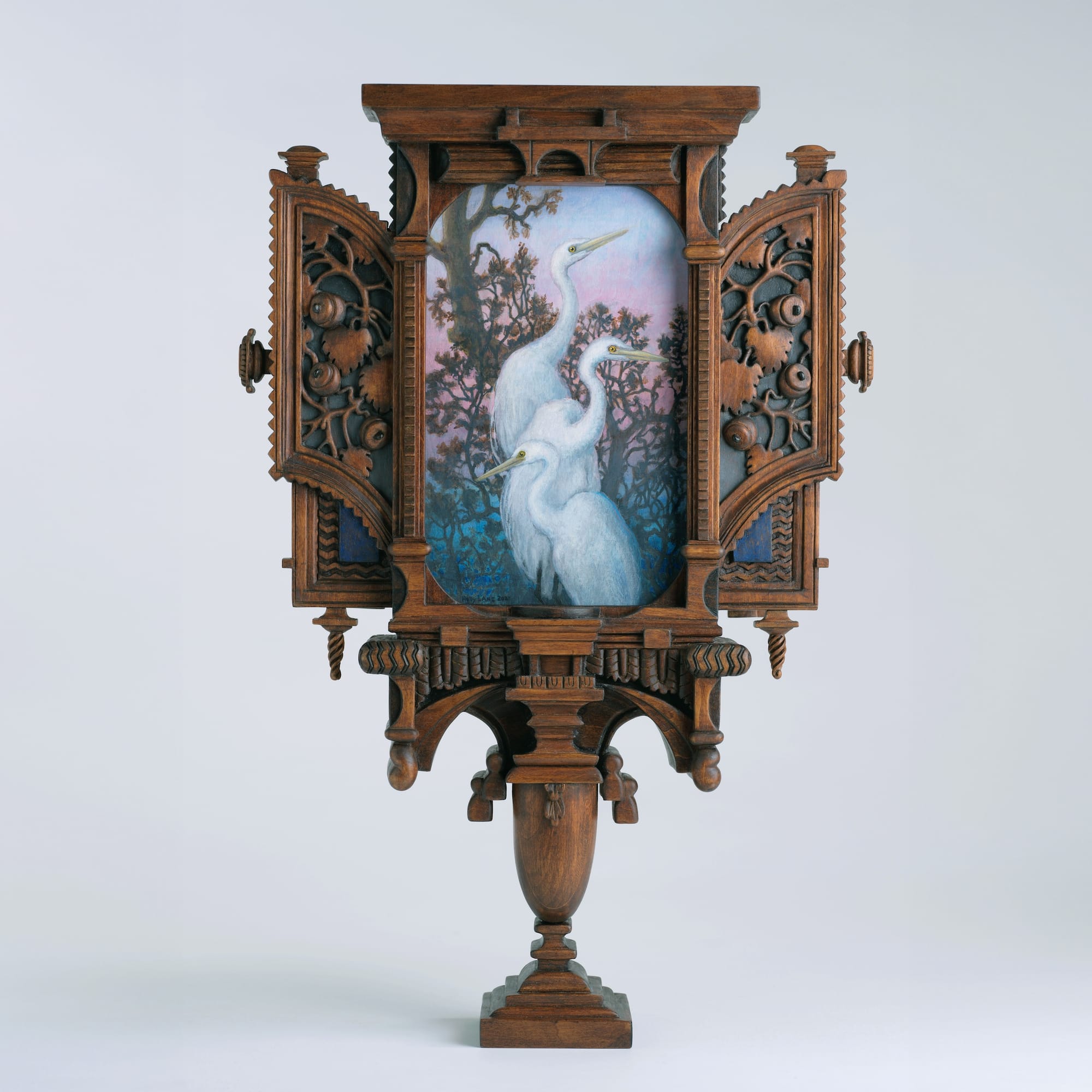 The artist evokes a keen awareness of the threats facing the environment by honoring it through opulent, reliquary-style frames and delicate paintings.