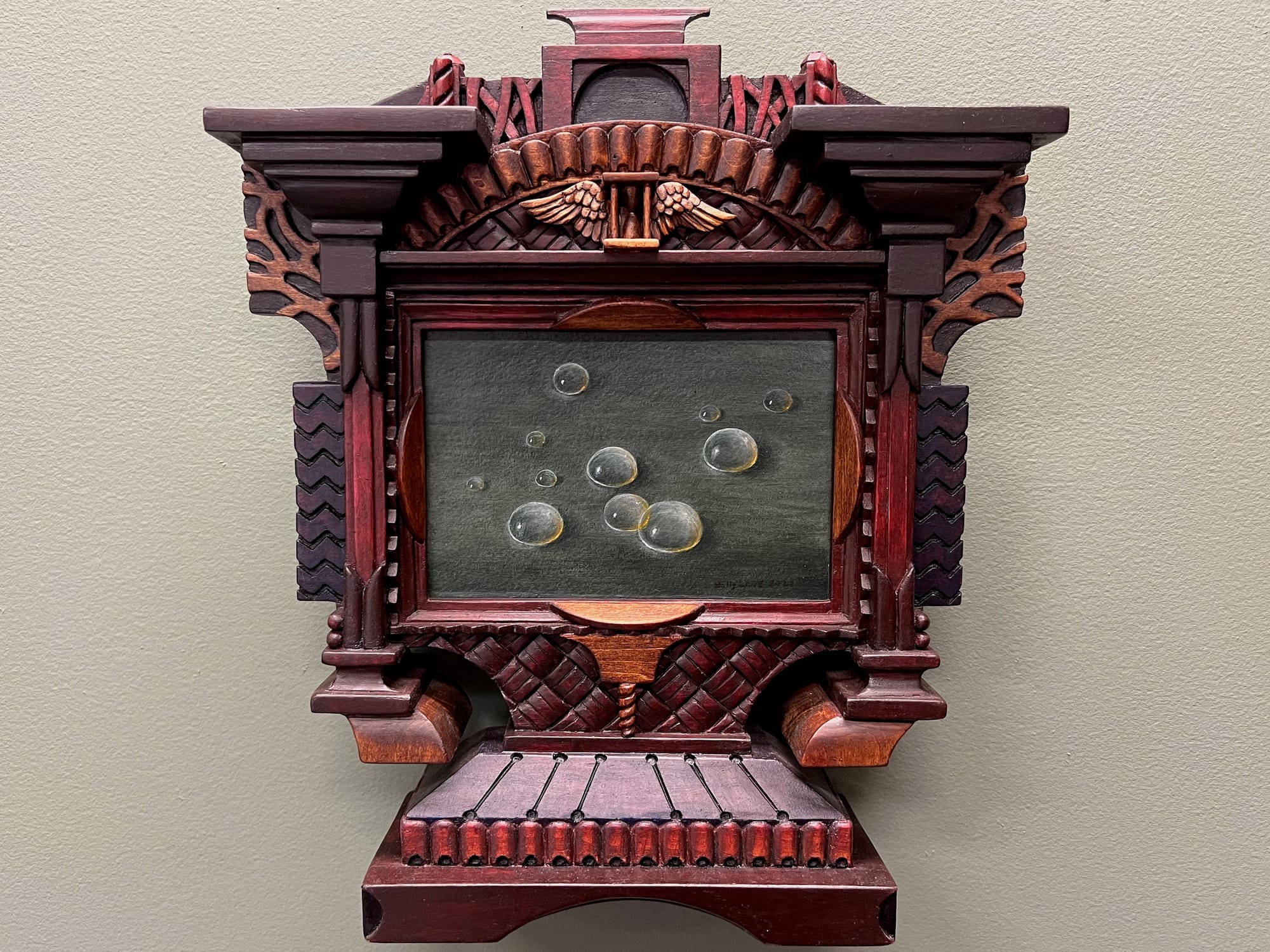 In response, Lane has spent nearly four decades exploring and exploiting the possibilities of reliquary-style frames echoing early Christian carvings and marginalia. In her art — which hybridizes painting and sculpture — everything works together to create shrines to the natural world and honor its sanctity. At the entrance of Lane’s show in Los Gatos is the piece that gives the exhibition its name: “Not Enough Time to Love the World” (2022). It presents an image of bubbles, a symbol of ephemerality. Directly above, carved into the frame, is a winged hourglass that evokes the passage of time hovering beneath an arch symbolizing the span of our lives. In concert, these images tell us that the contemplation of nature is now increasingly charged by a keen awareness of the threats it faces.