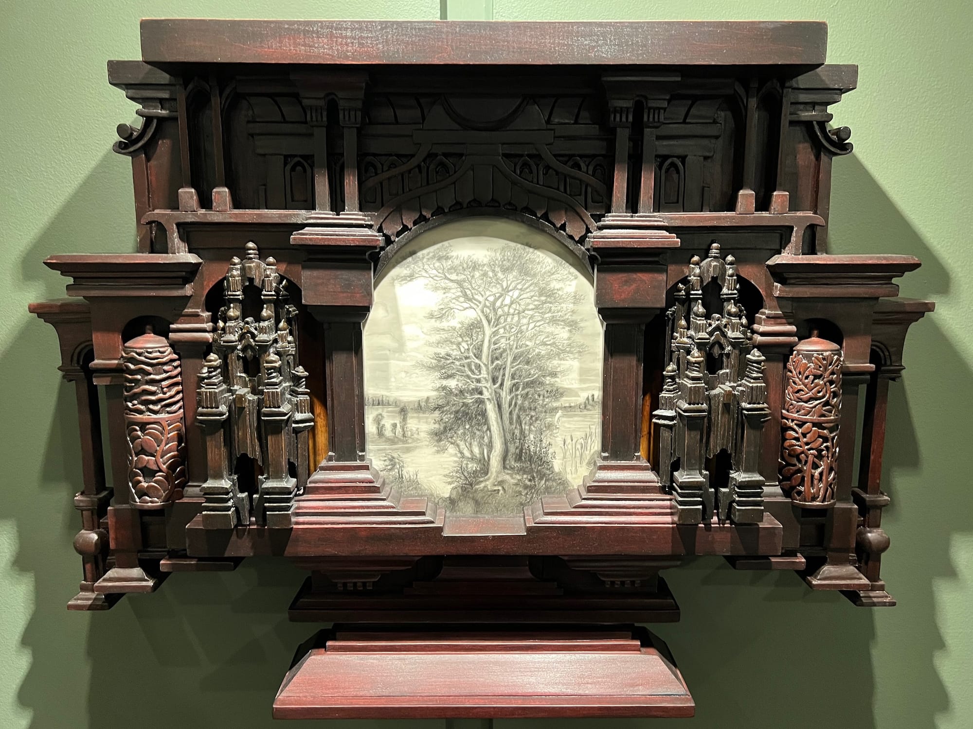 Another work, “Gentle Muse” (2010), honors trees and their function as fuel, shade, construction materials, and pharmaceuticals. The Gothic-style side carvings of its frame recall the architecture of churches and are complimented by cylindrical apothecary jars. The central image of the tree, executed with graphite on mylar, has an elegiac quality that works in concert with the reliquary character of the frame.