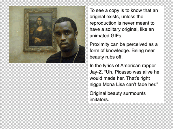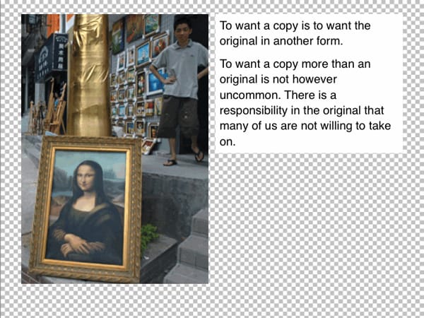 We were asked to prepare manifestos on the topic of doubling or copies, fakes and replicas as part of a Manifesto Series to mark the arrival of Serkan Özkaya’s “David (inspired by Michelangelo).” I was told we could be as serious or humorous as we wanted to be so I focused on the nature of the copy and what it means today. I chose Leonardo’s Mona Lisa as the focus of my visual presentation, which I thought complemented Özkaya’s Michelangelo-inspired work, and offered some ideas that have brewing in my head on the topic.