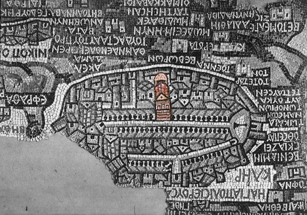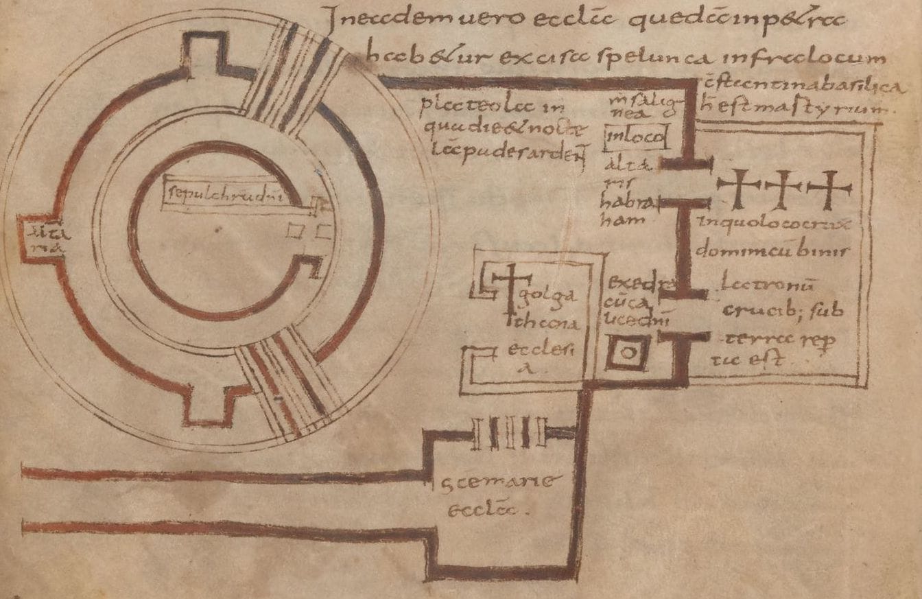 Archaeological knowledge of the Constantinian-era basilica is sparse. There are written mentions of the basilica from fourth-century Christian pilgrims and later writers such as Jerome, who visited and wrote about it. It is also depicted on the sixth-century mosaic in Jordan known as the “Madaba Map.” However, in 614 CE, the Sasanian king Khosrow II directed his general, Shahrbaraz, to enter Jerusalem and sack the city, carrying off the True Cross (the cross on which Jesus Christ is said to have been crucified). Later Christian sources attributed the discovery of the True Cross to Constantine’s mother, Helena, and thus linked the True Cross, Constantine, and the church together. During this seventh-century sack, a fire greatly damaged the original Constantinian complex, but it was later repaired by a bishop named Modestus.