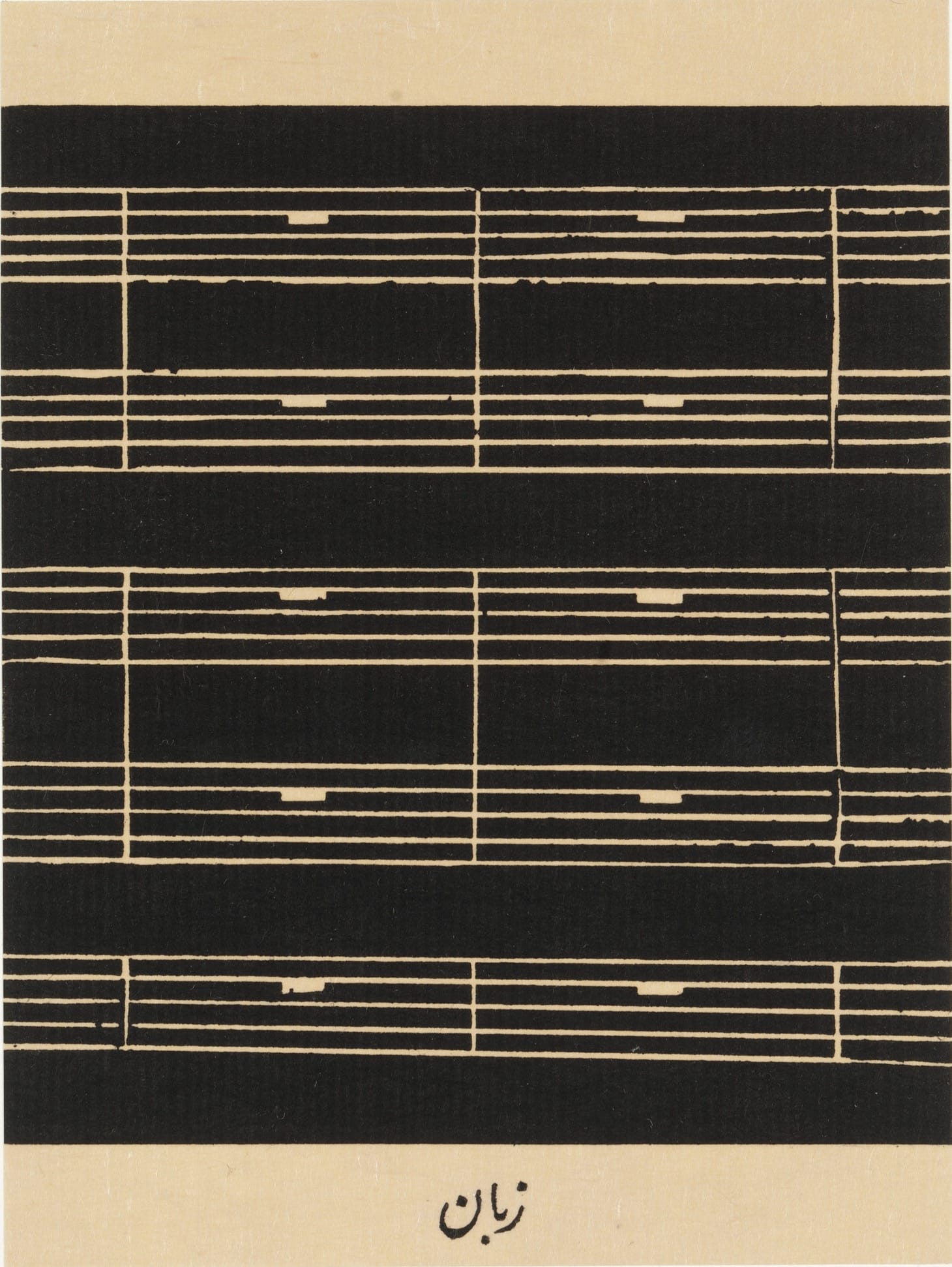 The 36 woodcut prints in Zarina’s portfolio, “Home is A Foreign Place” (1999), strike me at the base of my throat. Abstracted images mutate and bear different Urdu and English words, beginning with “Home,” a floorplan of the artist’s childhood house in Aligarh, India. A dark barrier, “Wall,” hollows out into a circle, “Sky.” “Dust,” an earthen black block, settles beside “Language,” a rest, the musical symbol for silence. Zarina doesn’t illustrate words so much as unravel them, revealing the buried places from which we speak.