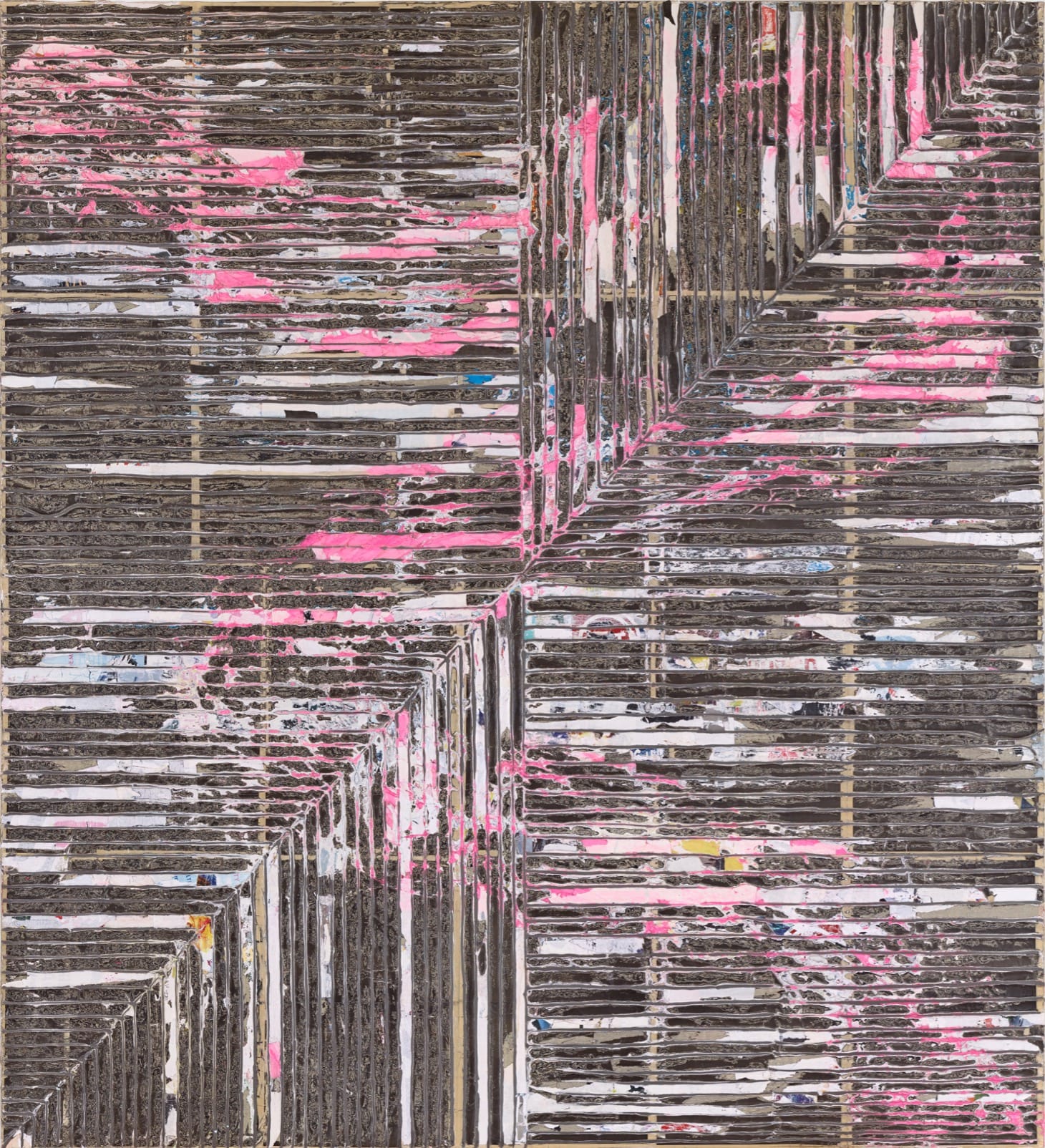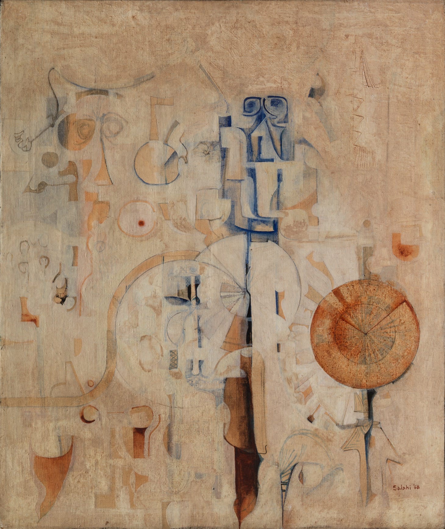 The first gallery gathers works by Asian, Arab, African, and American pioneers of abstraction. Paintings by Mark Rothko, Mohan Samant, and Adolph Gottlieb experiment with visuals from nonwestern cultures. Yet do their forays into the foreign contradict an aesthetics of home? Evident in his incantatory painting “Alphabets” (1962, reworked 1968), Ibrahim El-Salahi abstracted Arabic and African iconography to reflect the everyday environment of Sudanese people amidst decolonization. Nearby, “Love Letter I,” a 1969 Anwar Jalal Shemza painting weaves alphabets into an architectural mesh. In “Structure with One Thousand Pieces” (1966-68), a Saloua Raouda Choucair sculpture, irregular sequences of wooden fragments compose a tower that scatters the lamplight within. These artists explore collectivity and infinity through small, in-between spaces.