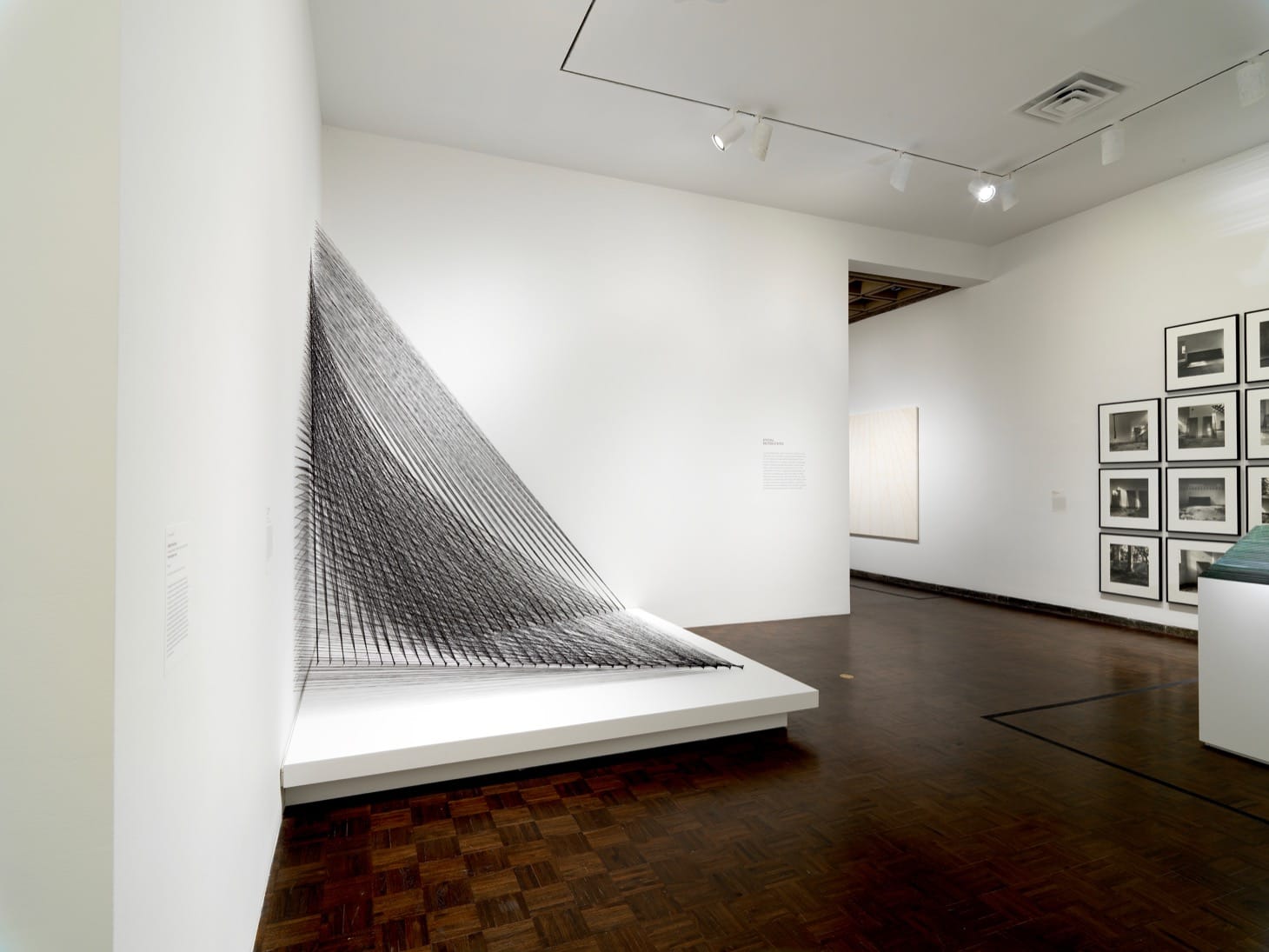 Prabhavathi Meppayil’s panel responds to our presence. Humming wires embedded in gesso flash if we shift perspective. The metal will rust, creating a work that wants us not to look, but to watch. Nailed to the surrounding space, the dizzying strings of Kazuko Miyamoto’s untitled 1972 installation shimmer as we move around them. Rooted yet atmospheric, hand-knotted threads recall feminized (and increasingly migrant) labors, such as domestic work or care work, that make spaces habitable. Simryn Gill’s long-exposure photographs document abandoned vacation homes in Malaysia that were raided for fixtures. Rhythmic configurations of window panes unfold across rubble-strewn rooms. The transient memorializes transience; light records light, and shadow shadow.