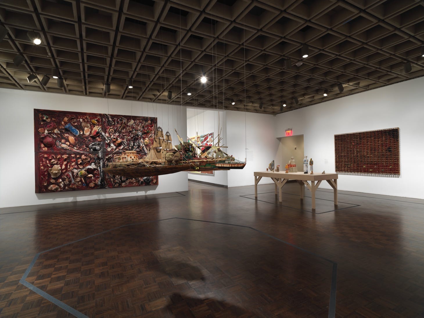 From patrimony to debris, a last gallery positions assemblage amidst global trade and conflict. Michael Rakowitz recreates objects that disappeared from the National Museum of Iraq following the 2003 U.S. invasion. Newspapers and packaging of foodstuffs exported to Arab-American communities imitate stone, deflecting the surveillance of foreignness through camouflage. Hew Locke adorns model vessels — from an imperial galleon to a refugee skiff — in flotsam. Suspended from the ceiling, these bundles of colonial history double as votives for precarious lives. In a humbling video by Donna Conlon, ants foraging in a Panama forest carry leaf-like national flags and peace signs back to their nest.