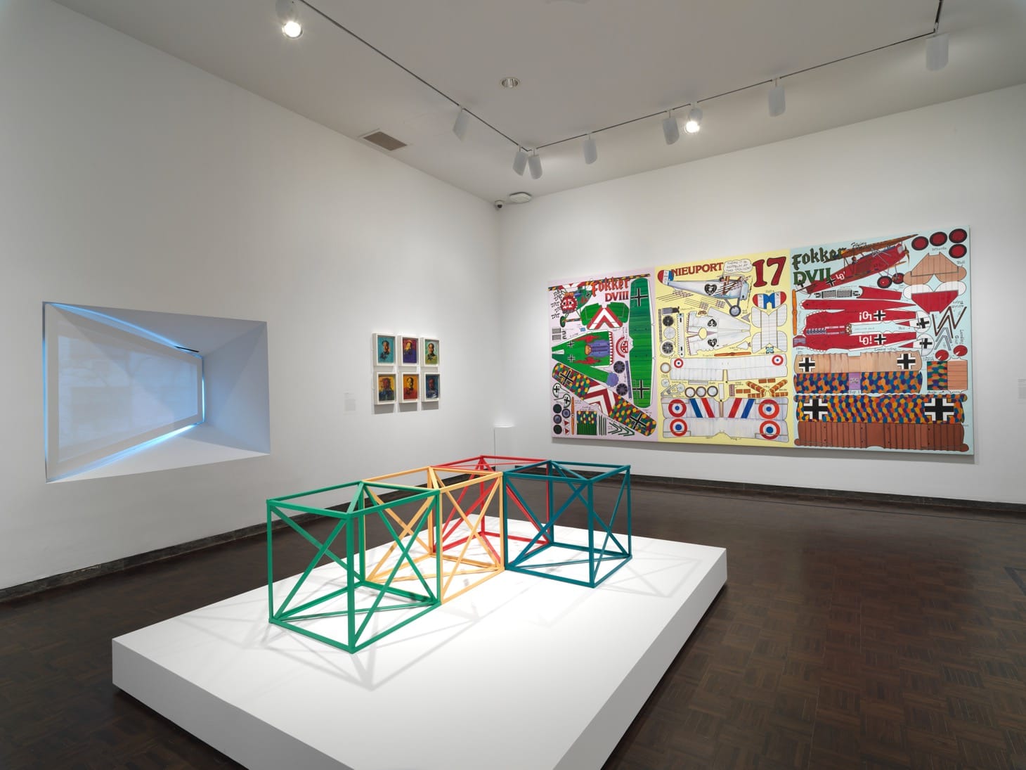 Global breadth sacrifices depth. The exhibition highlights the movement of styles and commodities over movements for liberation and aesthetic qualities of space over generating social space. Major figures stand in for the local worlds they navigated, where other homes for art emerge. An advocate for Asian and African modernists in postwar Britain, Rasheed Araeen resisted institutional exclusion by building Black and developing world cultural networks. Due to their fragility, museum staff periodically rearrange the timeworn, latticed cubes of Araeen’s “Chaar Yaar (Four Friends)” (1968/2010), instead of visitors doing so as the artist first intended. Although situated in a gallery of Pop Art parody, the work’s politics lie in interaction rather than imagery. Edgar Heap of Birds makes a more precise intervention in space. For a 1990 riverside commission in Minneapolis, he installed 40 signs that appropriate standard government format to commemorate Dakota people who fought relocation and were executed by the U.S. government in Minnesota in 1862. Three signs are displayed here, their site-specific power albeit dimmed. Yet the Dakota men’s names, emblazoned with the direction “honor” on weather-resistant, enameled steel, lodge in my throat. “Ma-ka’ta I-na’-zin.” “Ho-i’-tan-in Ku.” “I-te’ Du-ta.” Language can entrap, but it can also protect.