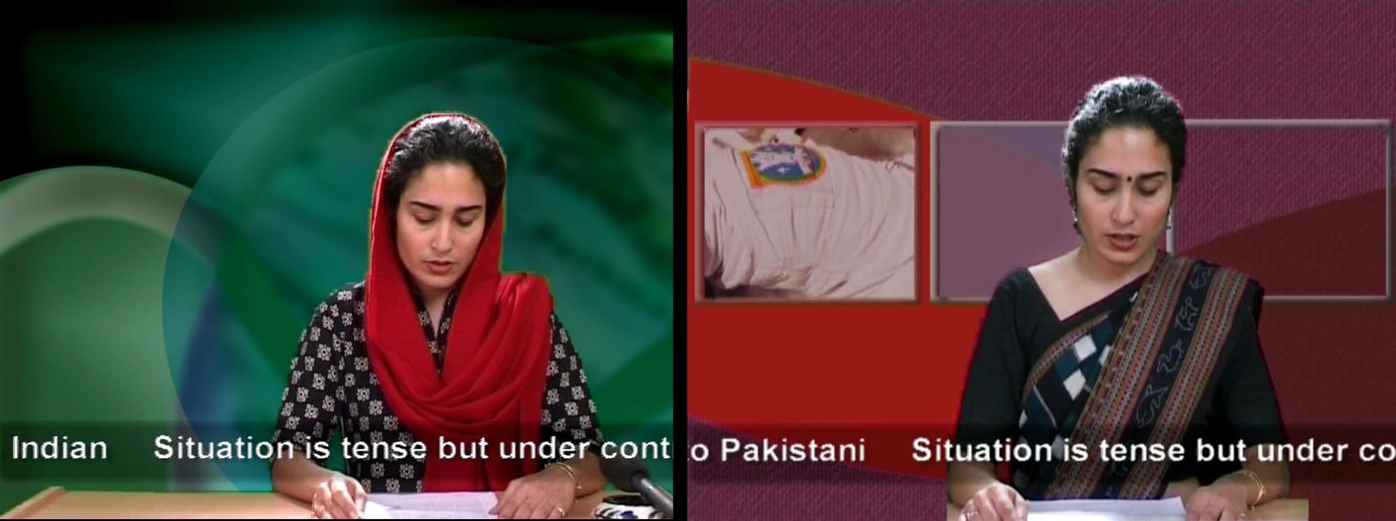 There are other moments humor in the exhibition. In Bani Abidi’s video diptych “The News” (2001), two TV anchors deliver the same absurd news bulletin about an incident involving the theft of an egg. One anchor is dressed in an Indian saree and speaks Hindi, while the other wears a Pakistani dupatta and speaks Urdu. Both roles are performed identically by the artist herself, illustrating what the postcolonial theorist Homi Bhabha terms the “nearness of difference.” Also included in the exhibition are three of Iftikhar Dadi and Elizabeth Dadi’s spectacular neon sculptures of national flowers from the artists’ ongoing Efflorescence series, which pokes fun at the hyperbole of patriotic pageantry.