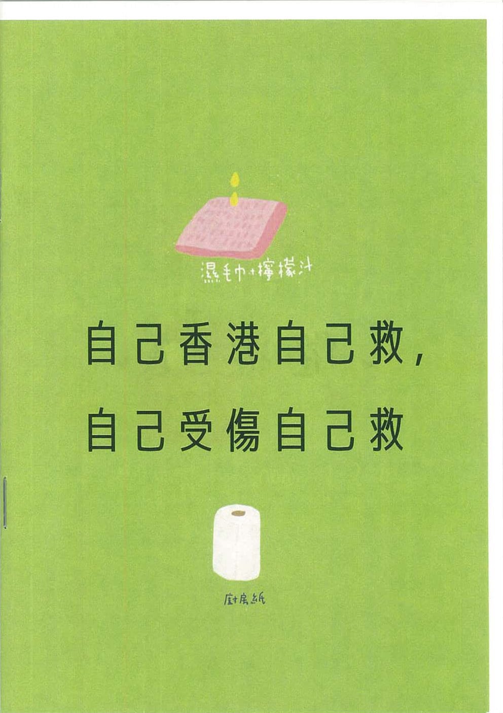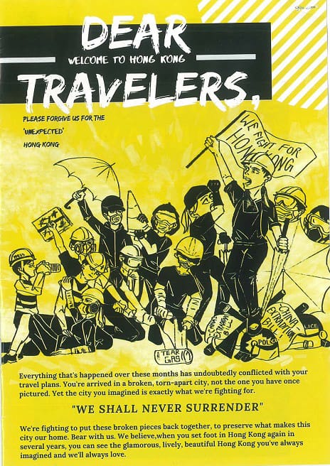 Several of the zines aggregate necessary information ranging from basic first aid and tips on how to avoid incapacitation from teargas and pepper spray — like Yan YU’s Chinese-language guide Save Hong Kong Ourselves that belies its subject with cheerful pink and green illustrations. Others are more concerned with the ongoing mental health of protestors beset by anxiety and fatigue, or the benefits of mutual aid and support, like Humchuck’s Post-Protest Emotions. Others take on a more didactic tone, such as the Dear Travellers zine created in English to explain to those stuck at the airport what the protests are about, including details of the Anti-Extradition Bill and the more recent demands being made of authorities; these were distributed from August 9-13.