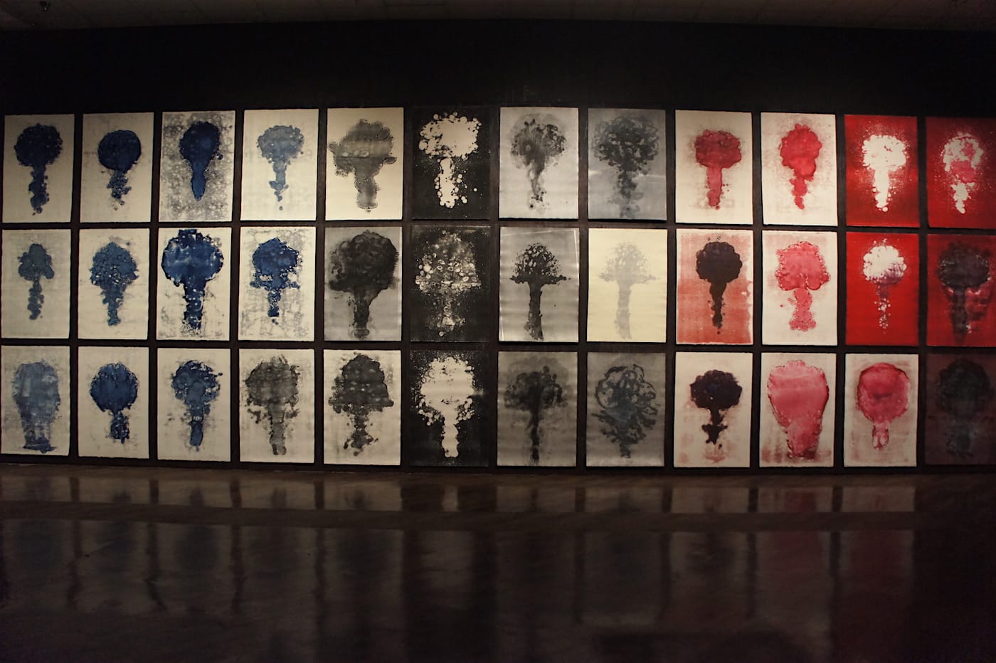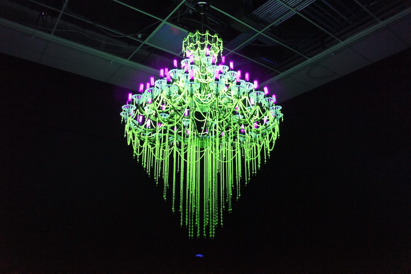 Other artists have created works to remind viewers how particular world events, such as the Fukushima nuclear disaster, have affected the Pacific. In a darkened room, Ken and Julia Yonetani have hung four antique chandeliers refitted with depleted uranium glass beads and UV lighting for “Crystal Palace: The Great Exhibition of the Works of Industry of all Nuclear Nations” (2013–2016). Glowing bright green and purple, the chandeliers represent four of the 31 nuclear nations of the world: the United States, Taiwan, Japan, and China. The larger the reliance on nuclear power, the bigger the chandelier. None can match the size of the United States.