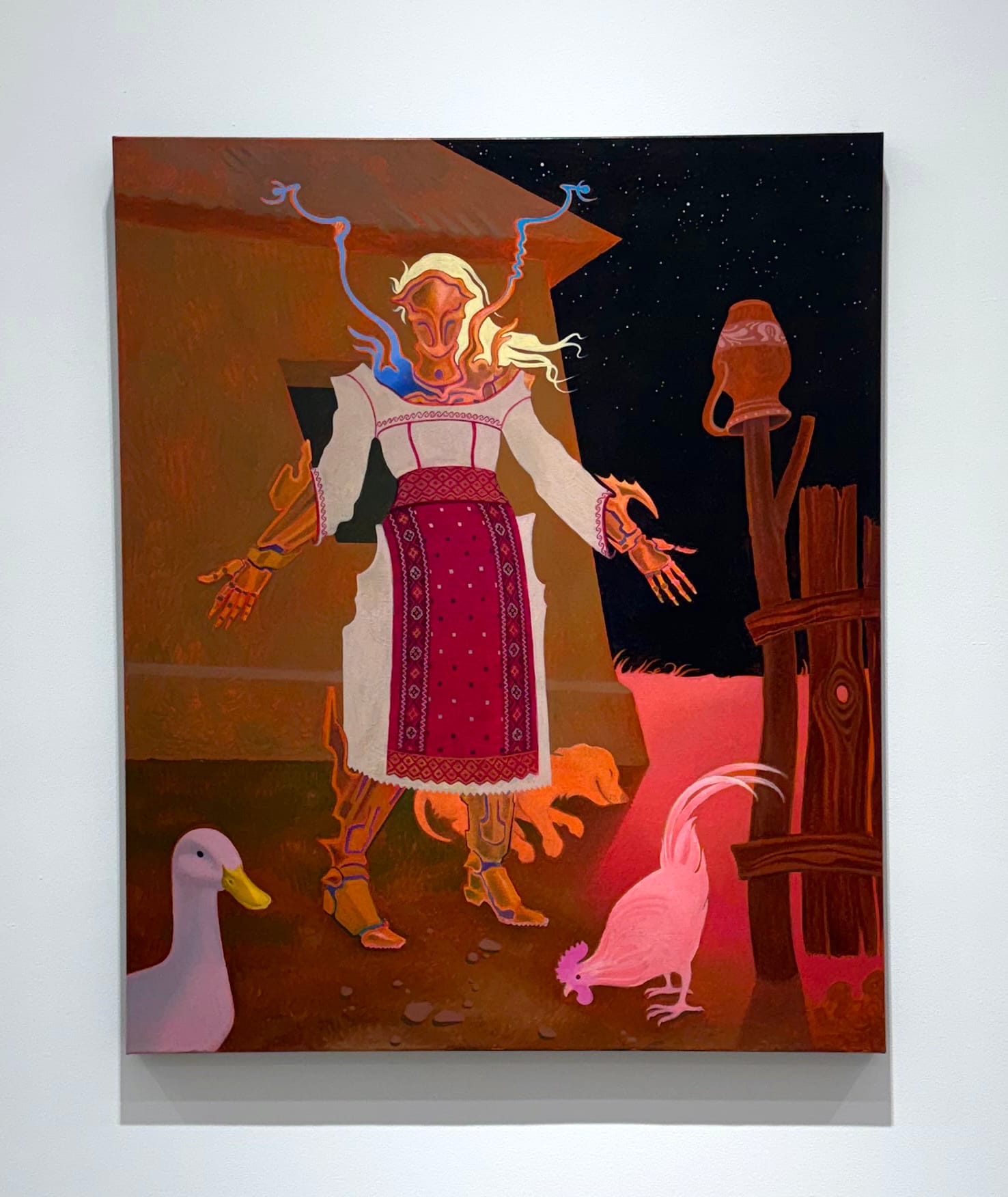Raised in Romania and now living in Berlin, Kafchin thinks like a historian by folding elements of the past — drawn both from human history and her own life — into a vision of what humanity could achieve, if we could only pull together in one life-affirming direction. The show’s most effective works are those in which a temporal collapse is figured within a single canvas. “Dobrogean National Costume” (2024–25) gestures toward the pastoral, which was the primary subject of Nicolae Grigorescu, who Romanians call their “national artist.” It portrays a figure intended to be read as female standing outside of a modest country home; a ceramic jug turned upside down on the post of a nearby split-rail fence is a sign that the family is trying to marry their daughter off. But in lieu of a conventionally human form, an orange-hued bundle of wires dons the national costume. Crackling with electricity, the figure subverts the traditionally gendered terms that a person in a pastoral image might evoke in favor of an openness to inhabiting multiple contrasting positions at once.