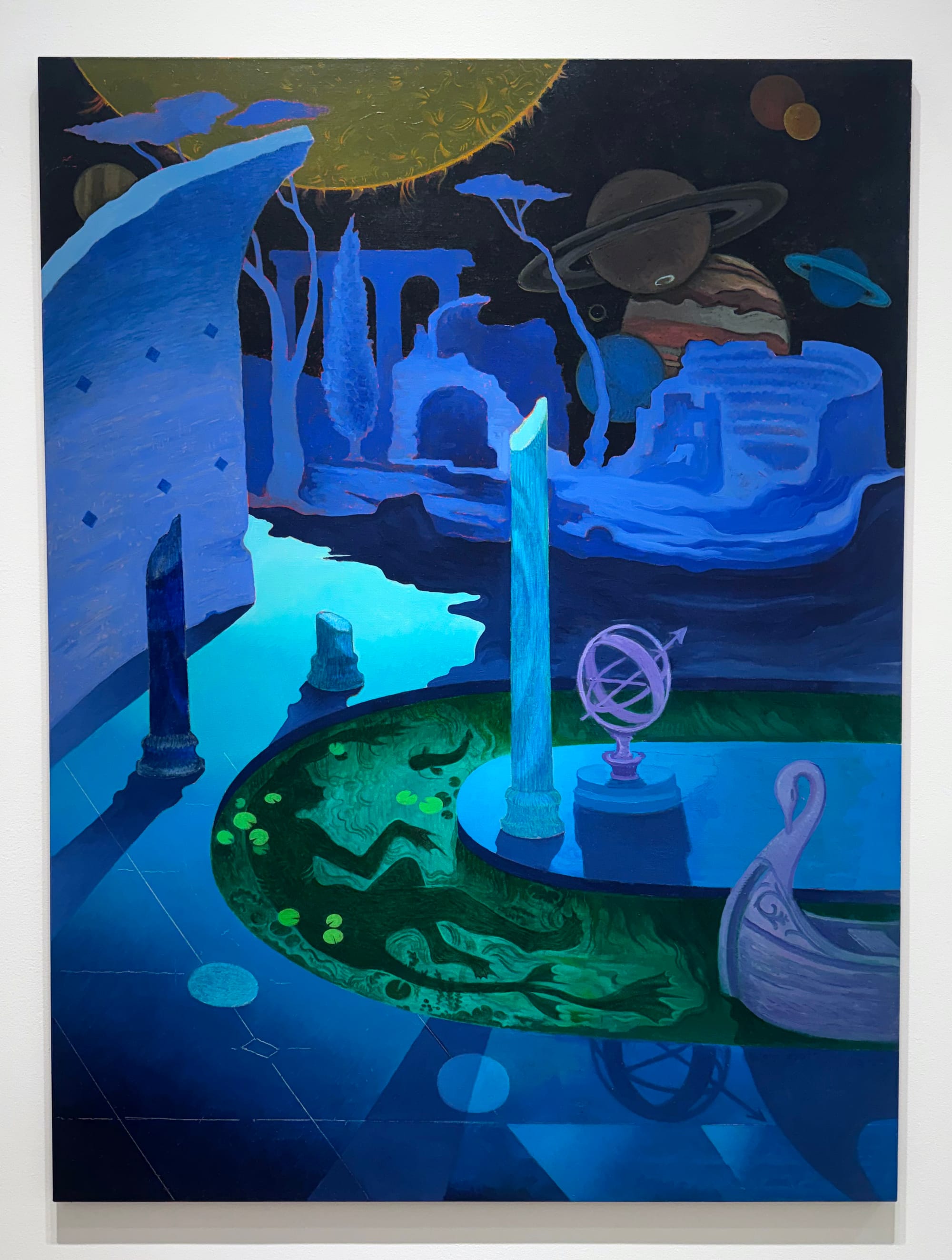 Hortensia Mi Kafchin: Paintings Made for Aliens Above continues at PPOW (392 Broadway, Tribeca, Manhattan) through December 20. The exhibition was organized by the gallery.