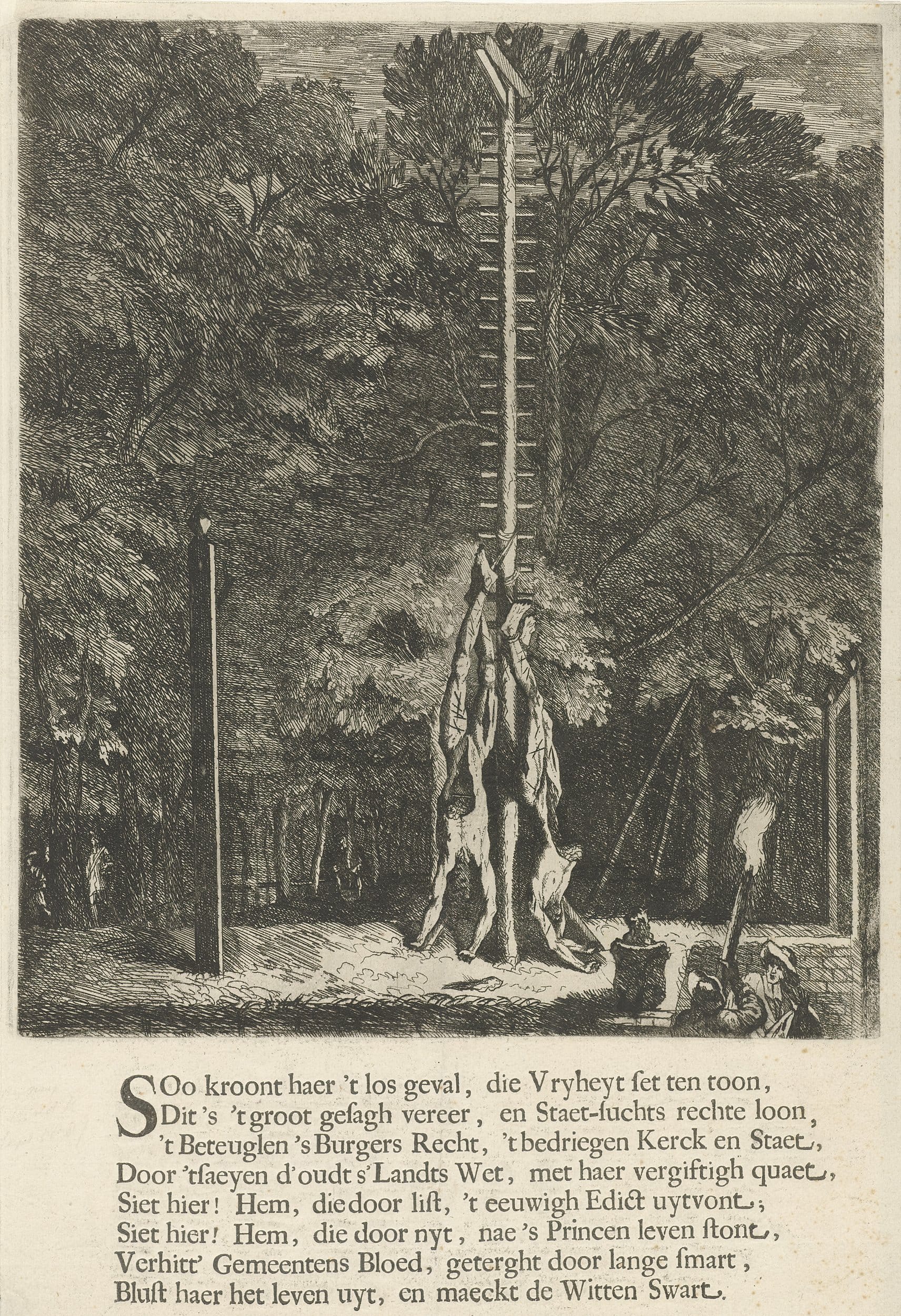 (These are the corpses of Johan and Cornelis de Witt, made by a prominent painter from life as they hung from the post at eleven o’clock in the evening. Cornelis is the one without a wig. Johan de Witt still has his own hair.)