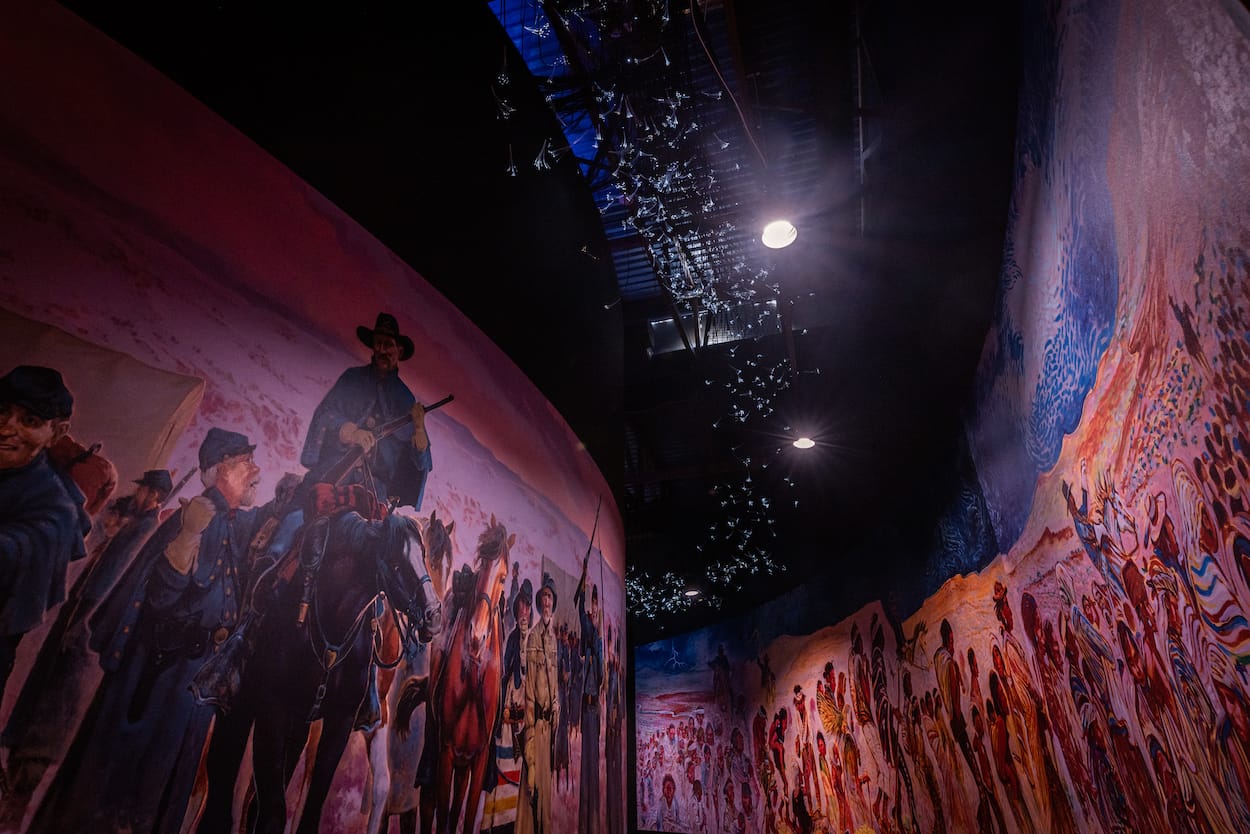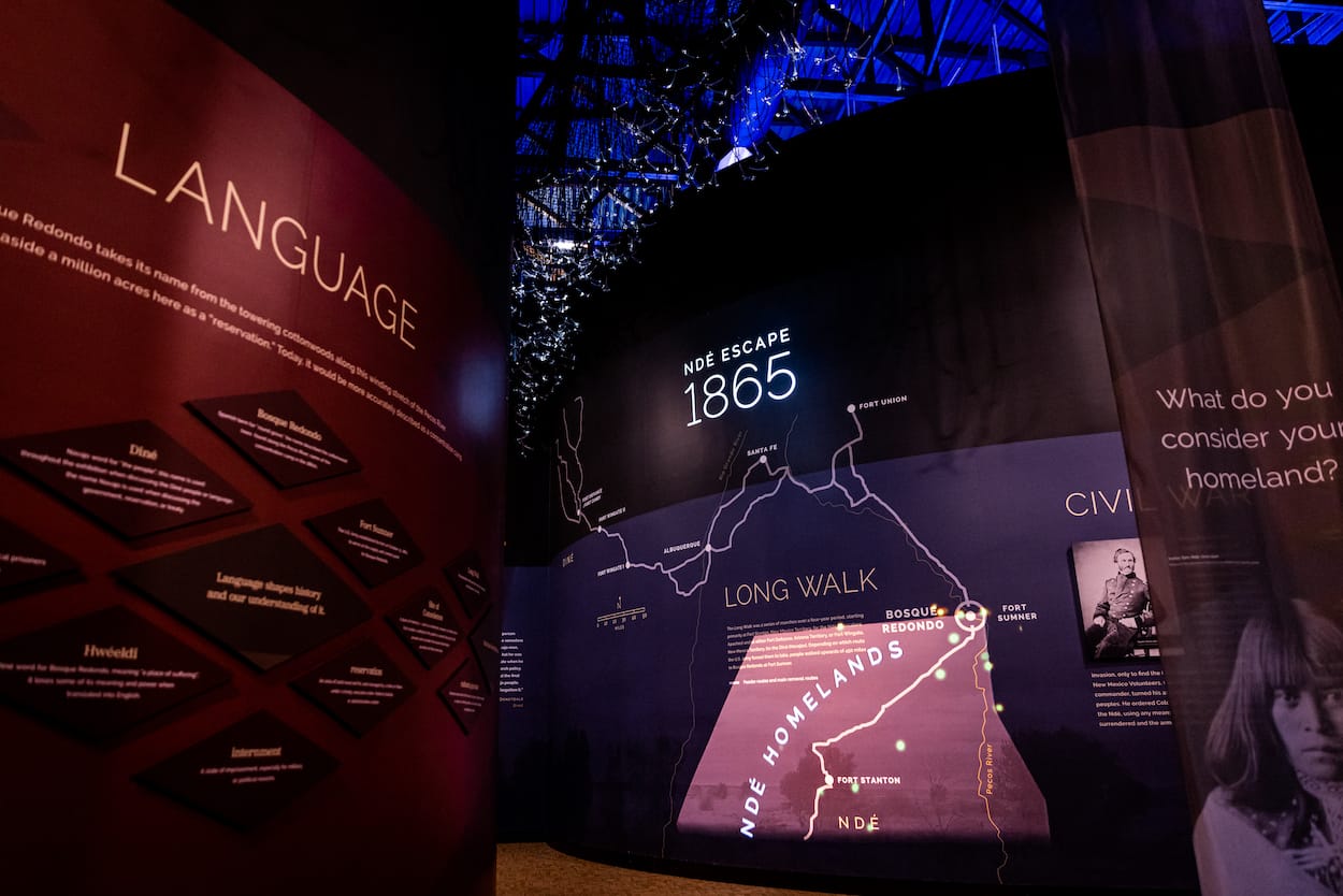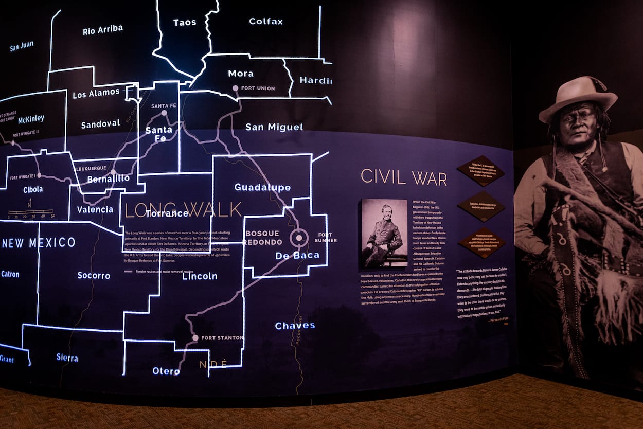The show’s central sweep starts with a curved hallway extending about 50 feet. Visitors pass between reproductions of a painting by Diné painter Shonto Begay that depicts the Long Walk, and a piece by a local artist showing a platoon of US soldiers marching towards Fort Sumner.