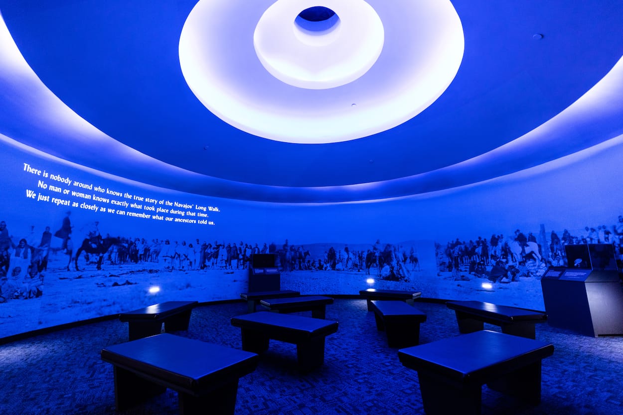 The hallway leads to a large circular room, referencing a Diné hogan and lit in a somber blue, that’s encircled with historic photographs of Bosque Redondo. Projections and recordings of quotes from Native storytellers and scholars activate display cases throughout the room.