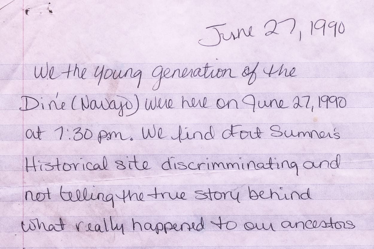 "We the young generation of the Diné (Navajo) [...] find Fort Sumner’s Historical site discrimminating [sic] and not telling the true story behind what really happened to our ancestors in 1864-1868. [...] We therefore declare that the museum show and tell the true history of the Navajos and the United States military."
