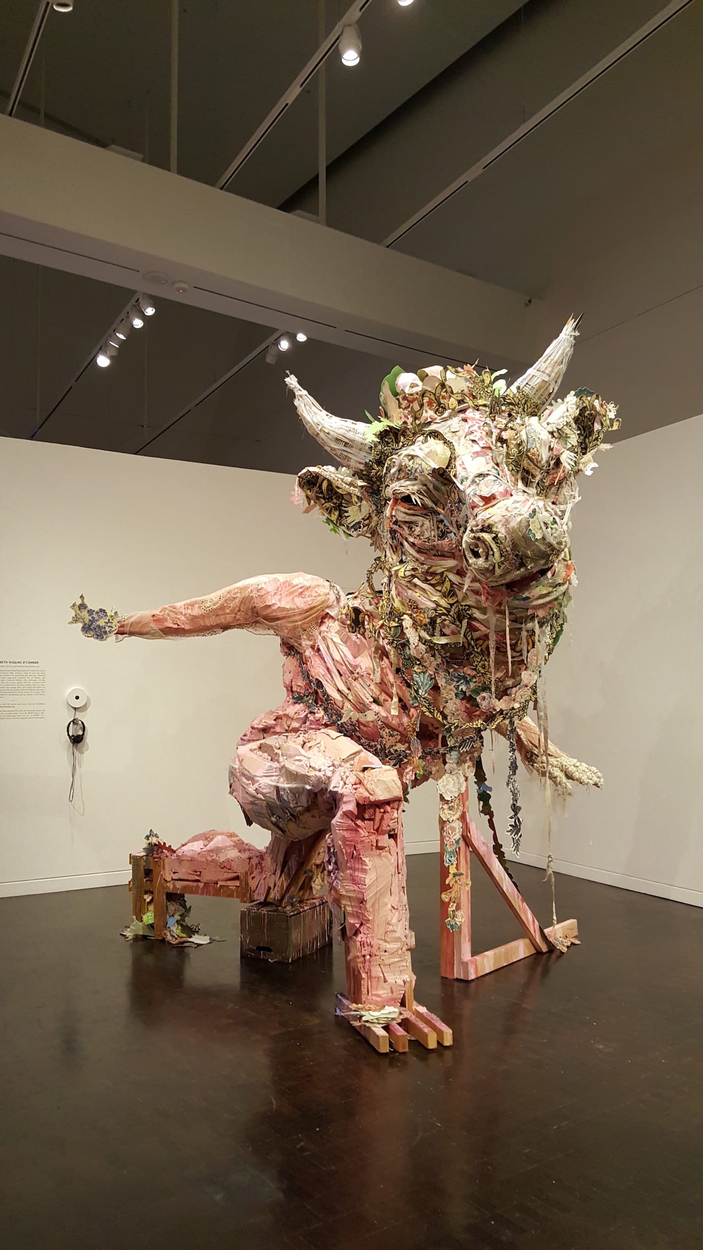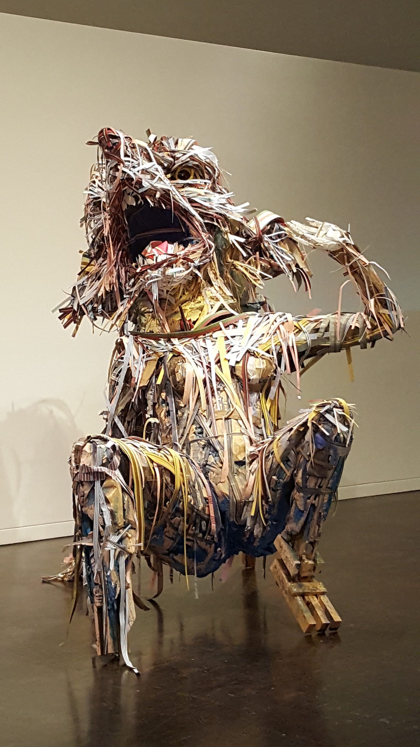 A few true standouts immediately impress. Elisabeth Higgins O’Connor’s “blame/thirst” and “lullaby lament” (both from 2017) are monumental and mystifying interpretations of the well-worn golem mythos. Her artwork is site-specific and crafted in accordance with what the space seems to need and permit. Despite their size, (“lullaby/lament,” for instance, is probably four feet by seven feet at the base and ten feet high) the lace and paper in which they are at once crowned and clothed lift and dance thus adding a weightlessness which belies their enormity. These ideas are complemented by the evocation of the golden calf in “lullaby/lament” and the she-wolf in “blame/thirst.” Each of these golems are created in the guise of enemies subversive and overwhelming, respectively.