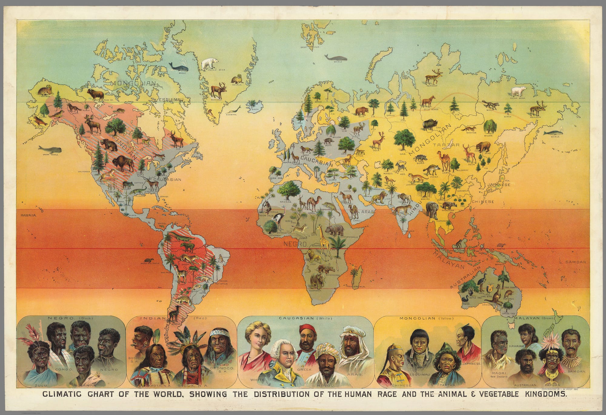 Notably, the map legend color-codes the aggregations of “Mongoloids, Caucasoids, Negroids, Polynesians and Melanesians” that were commonly used by ethnographers of the time. These labels hearken back to an 1893 educational chart created by Levi Walter Yaggy that classified humans as Black, Red, White, Yellow or Brown. These artificial color constructs persist today in both unifying (e.g., Black Lives Matter) and insulting (e.g., Yellow Peril) ways.