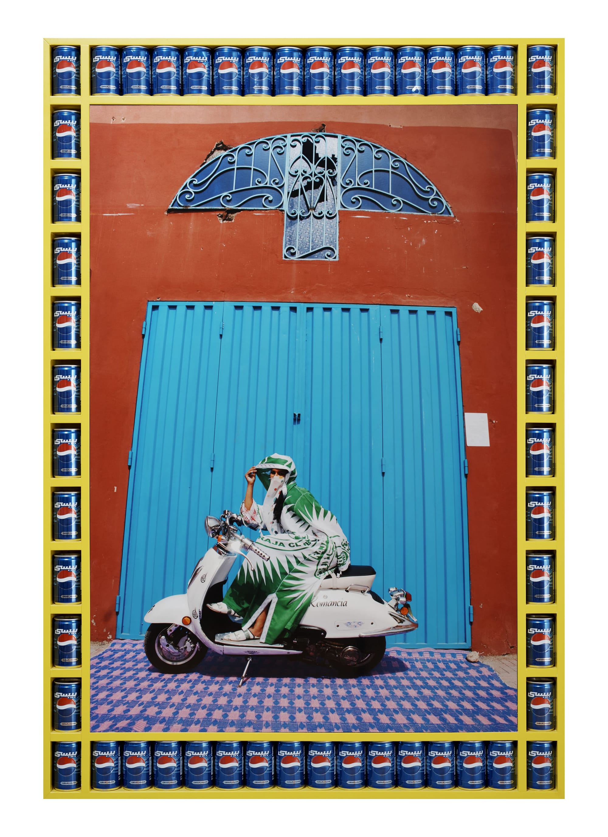 One participant thought the model’s caftan looked like a soccer flag, and her hunch was quickly affirmed by a moderator, as the dress was indeed made from a Raja Casablanca flag. Another virtual visitor, upon examining the soda cans written in Farsi, recalled a 1961 Pepsi jingle: “For those who think young.” A third participant continued this train of thought by discussing the timeless quality of the work as evidenced by the artist’s juxtaposition of the old and new in the image.