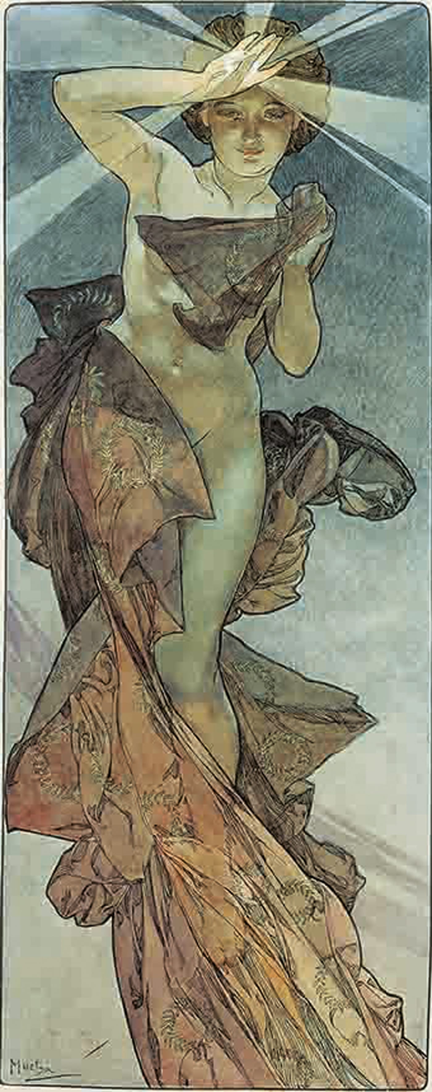 That ‘future is female’ theme — here again styled as ornamental integration as first addressed in the Bernhardt work — now reads like a message-in-a-bottle lobbed into the future. For me, and anyone who grew up on the Beatles in real time, mystic Mucha, creator of the much beloved “Job (rolling papers)” (1896) image, is hard not to see through the lens of the potted Sixties: dime bags of pot, hookahs, candle lit rooms, bare floors and mattress, curling incense smoke, Eastern ornamental fabric curtains, jamming guitars. Because he is so closely associated with that hippy style, subsequent generations may have found him difficult to take entirely seriously. But believe me that his smoky stylishness slotted in perfectly around 1967 to the political-cultural shifts in a counter-cultural mood that combined feminism, passivism, racial idealism, hedonism, and economic optimism. This stylish hippy temperament — laden with spirituality, hidden meanings and symbolism — was exhibited in the period’s flamboyant clothing fabrics, in rock concert posters, and album music covers; all basically inspired by the exquisitely flowing lines of Egon Schiele, the art of Aubrey Beardsley and Georges de Feure, William Morris’s wallpaper designs, William Blake’s visionary drawings, and Mucha’s whirling shapes expressing ersatz reveries of quixotic females. “Seasons: Summer” (1896) and “Rêverie” (1897) offer two perfect examples. This kind of high daydream art (whimsical lines, fluid shapes amalgamating one into another, female figures with flowers and different ornamental detailing on their hair and bodies, the whole mood playful and yet aesthetically beautiful) accompanied hip folk, fueled by trippy LSD, hashish and especially marijuana, as they dipped into buddhism, paganism, mysticism, tarot cards, meditation, vegetarianism, the I Ching, the Bhagavad Gita, and The Golden Bough. Which is weird, as Mucha’s version of Art Nouveau — an inimitable mixture of sumptuous pattern and voluptuous female goddess form — was synonymous with the champagne gaiety and decadence of Belle Époque Paris during a period where technological and aesthetic innovation was only first meeting exotic eclecticism at various World Fairs.
