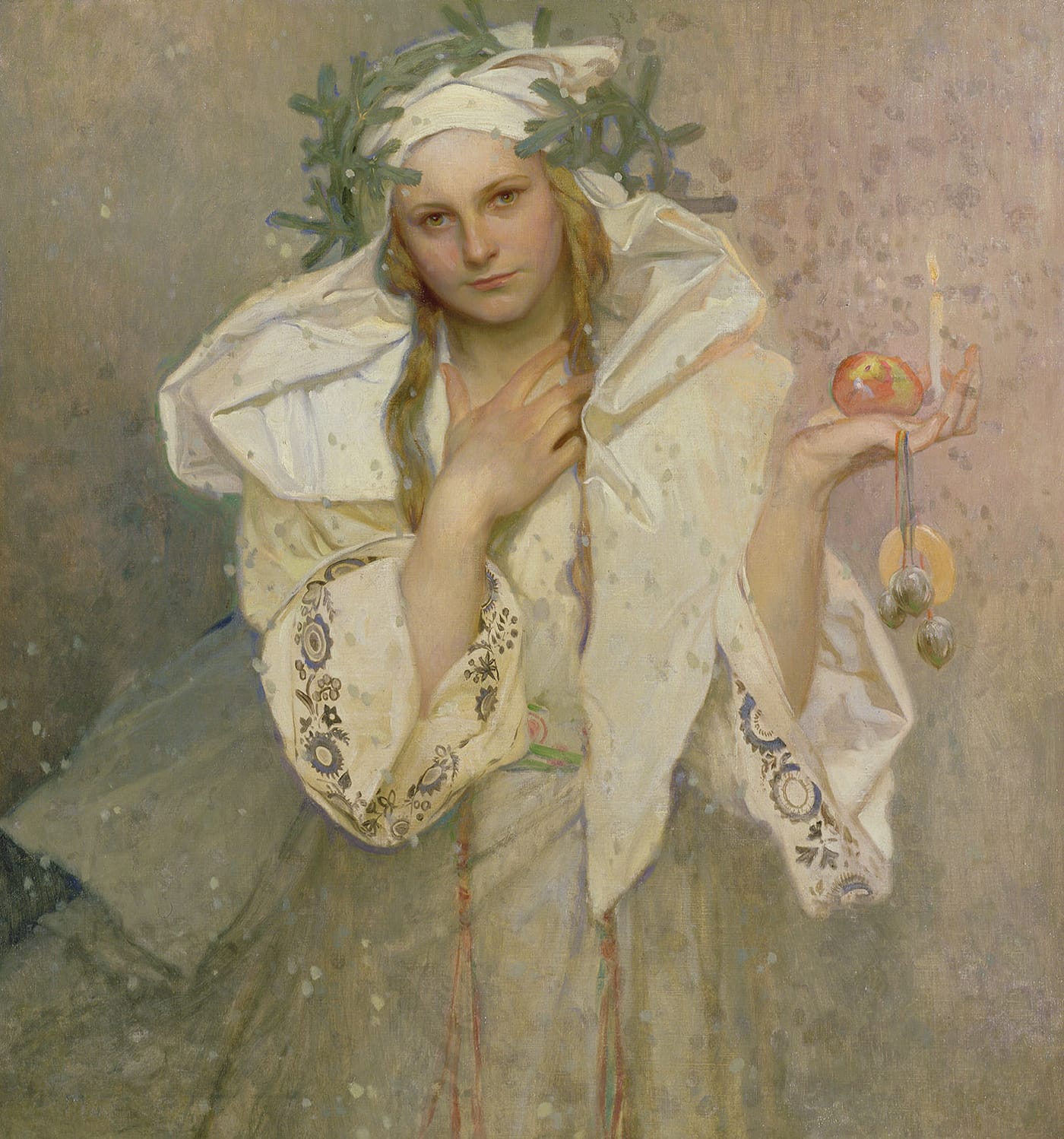 In March 1904, Mucha sailed for New York City, the start of his first visit to the United States where he would live on and off for years. There, he began painting in an ever more conservative illustrator style, as seen in the most unmodern “Christmas in America” (1919). His original intention for going to the States was to find funding for his previously mentioned grand project, The Slav Epic, which he achieved: from the anti-Semitic, Hitler sympathizer, Chicago connoisseur of Arab culture and noted Arabist Charles Richard Crane. Mucha also took in some income from teaching illustration and design at the New York School of Applied Design for Women, at the Philadelphia School of Art, and at the Art Institute of Chicago, while conceptualizing this nationalistic project to depict the history and civilization of the Czech and Slavic peoples. In 1910, imbued with masonic philosophy, Mucha moved back to the land of his birth (that would become Czechoslovakia eight years hence) to execute The Slav Epic project. It would occupy the last thirty years of his career and lead him to produce the bevy of bad behemoths that were mercifully excluded from the current show. He was arrested for being an occultist Freemason by Hitler’s Gestapo soon after the Nazis invaded Czechoslovakia in 1939 and died the same year of pneumonia.