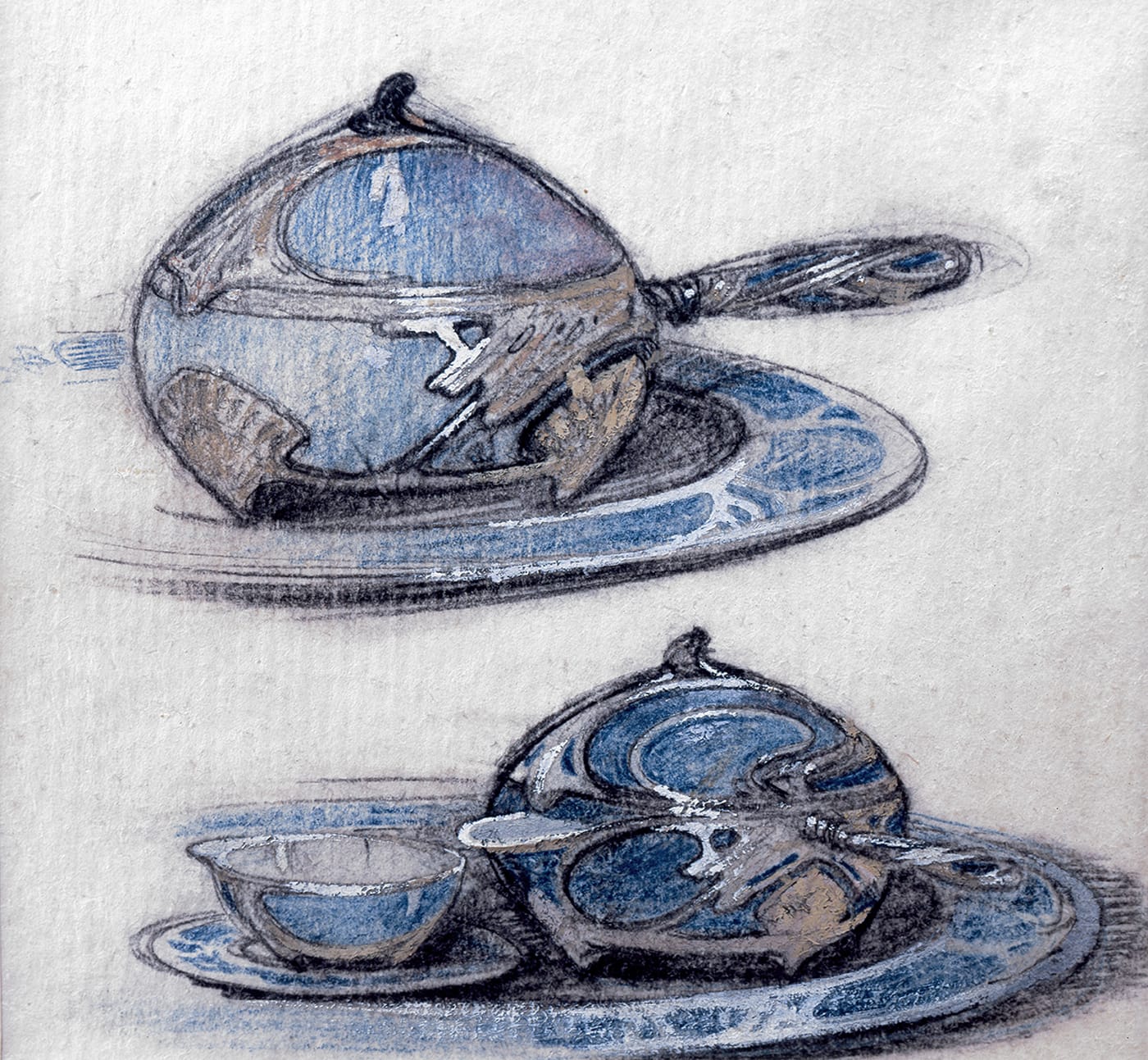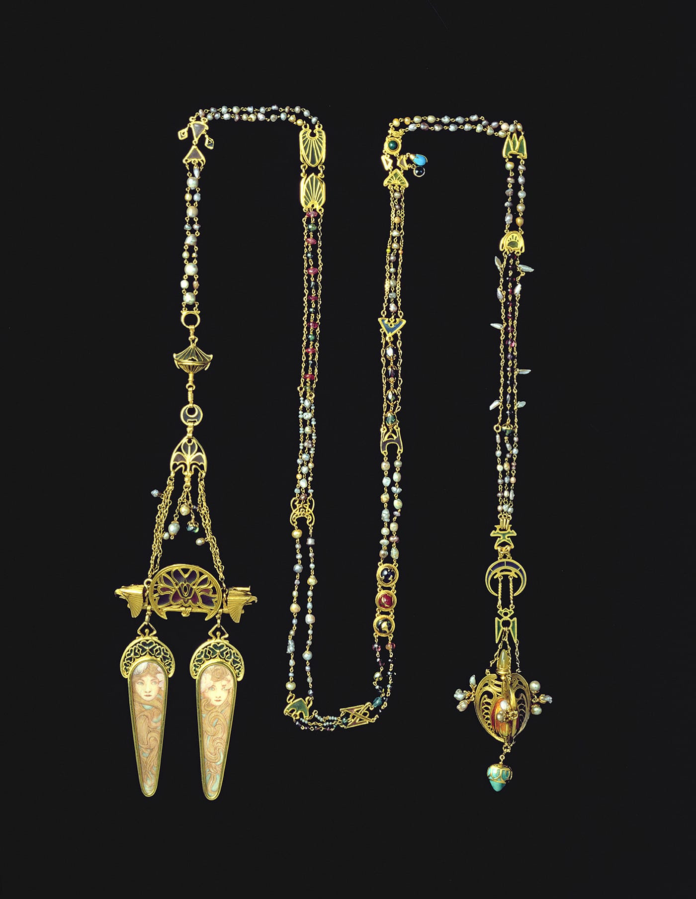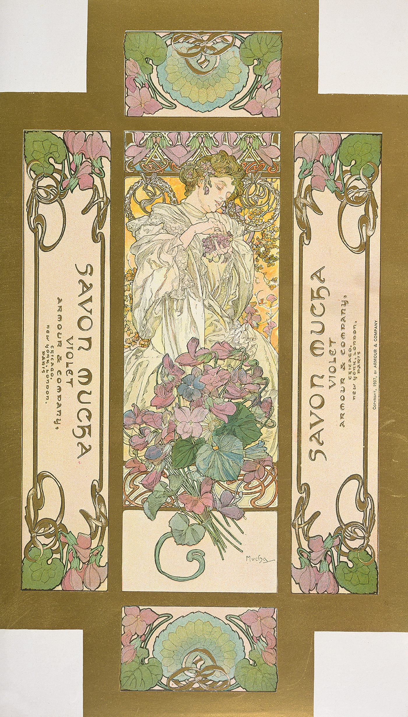 During the Belle Époque, with an infectious zeal for art hinged on exoticism, romanticism, and nostalgia, Mucha churned out everything from posters, decorative panels, and fabulous fabric designs — such as the velvet “Woman with Daisy” (1900), to calendars, table settings, menu cards, and wine labels. He even sold the proverbial soap: “Packing for Mucha Violet Soap” (1906). Not to mention his jewelry — like “Ornamental Chain and Pendants: designed by Mucha and made by Georges Fouquet” (1900) — sculpture, theatre, and shop designs, such as “Interior of Georges Fouquet’s Shop: Drawing for the Fireplace with Statuette, Mirror and Ornamental Details on the Wall” (c.1900). By most always depicting serene women at one with their surroundings, he helped sell almost everything there was to sell, all the while lamenting that his ‘real artistic-spiritual work’ went unseen (boo hoo).