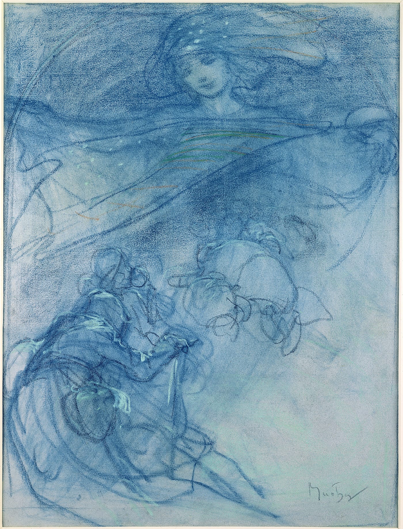 Undoubtedly, because Mucha is one of the most popular fin-de-siècle Art Nouveau illustrators, his less-stylized, but still sumptuously beguiling spiritualist work — inspired by his friendship with Swedish theosophist, painter, alchemist, novelist and playwright August Strindberg — such as Mucha’s phantom-like “Holy Night” (c.1900), “The Moon and the Stars (Study for “The Morning Star”)” (1902), and even the earlier “Zodiac” (1896) have been largely overlooked. Not so much anymore. The curator of the show, Tomoko Sato, of the Mucha Foundation in Prague, gives that spectral spiritual aspect of his oeuvre (a mystical sensibility that Mucha shared with fellow Bohemian in Paris František Kupka) equal weight, while happily underemphasizing his later work — notable for being bombastic and kitschy and nationalistic — as these paintings, The Slav Epic series, are not in the show.