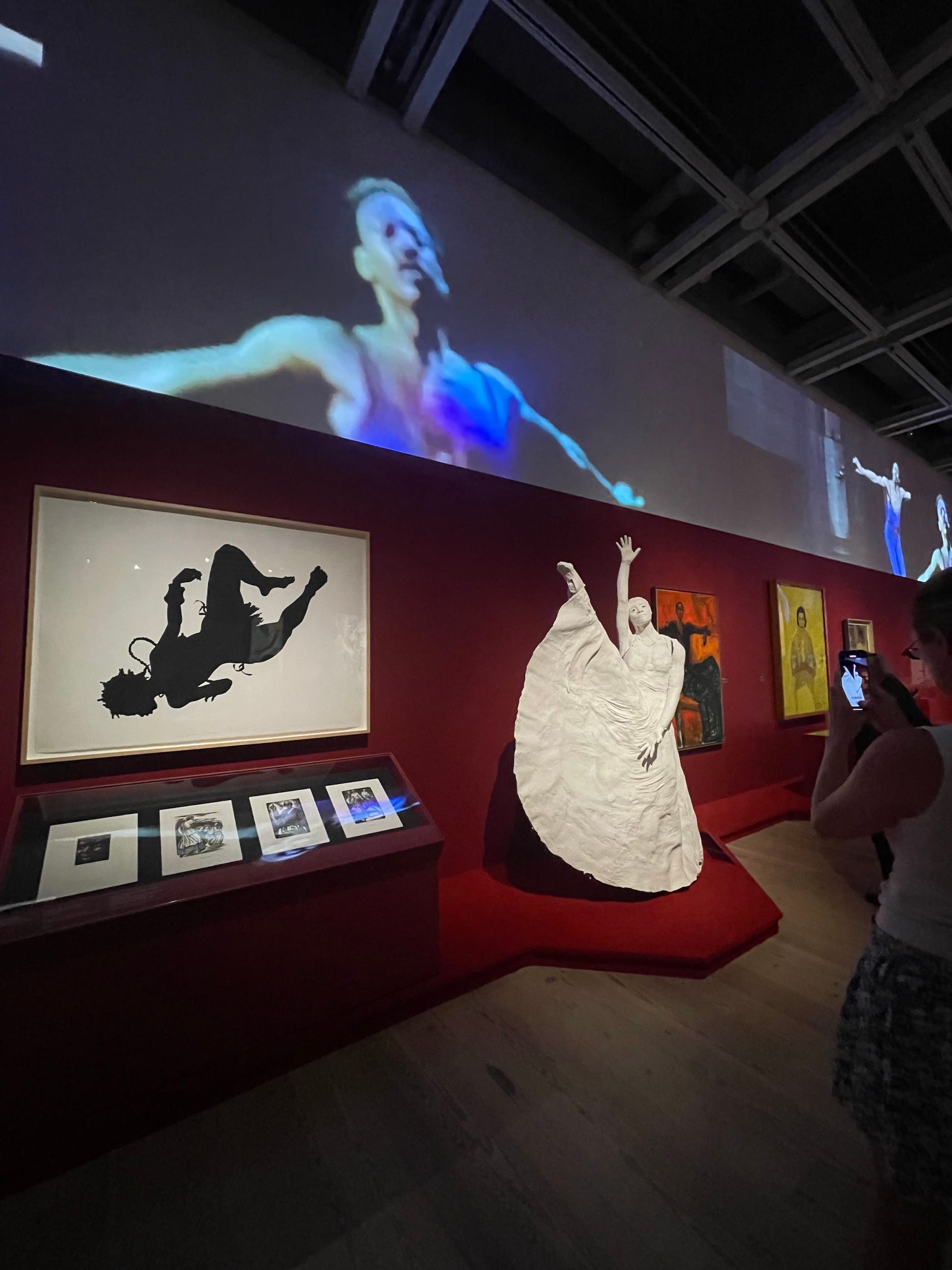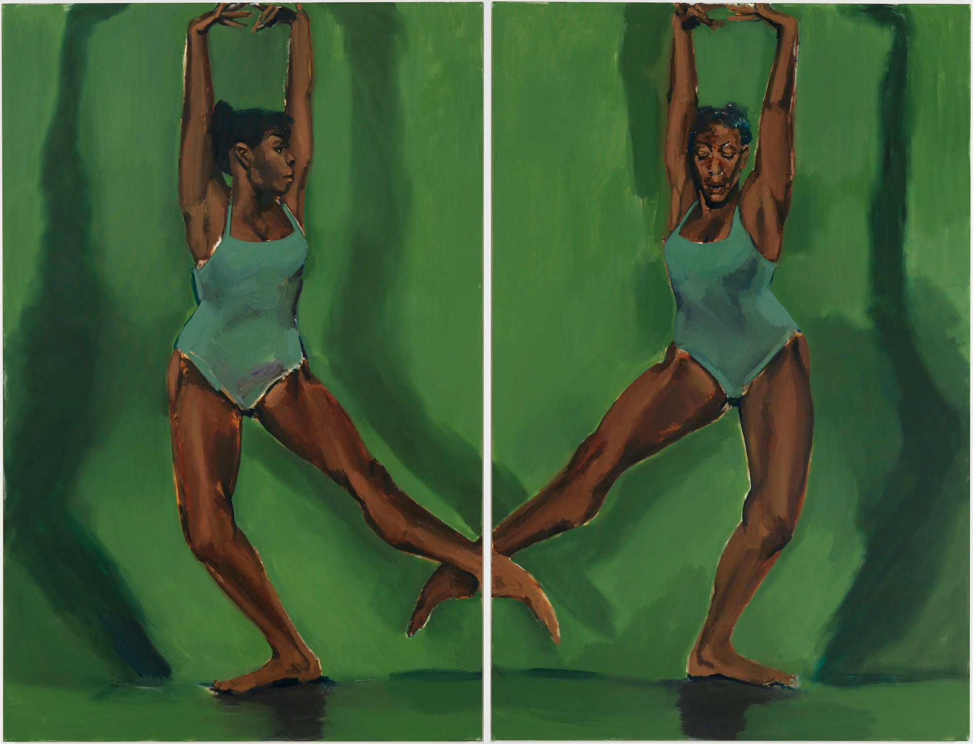 Among the exhibition’s direct references to dance are Barkley Hendricks’s painting “Dancer” (1977), depicting a Black woman in a white leotard set against a white ground; Senga Nengudi’s sculpture “R.S.V.P.” (1975), evoking a body or body parts through stretched nylon pantyhose and sand; and two paintings of dancers in rehearsal by Lynette Yiadom-Boakye, one of which was created specifically for this exhibition. These works are complemented by an 18-screen video projection of various Ailey performances, played on a loop throughout the space and accompanied by scores from Josh Begley and Kya Lou. Another section hosts videos of musicians, dancers, and choreographers who influenced Ailey, including Katherine Dunham, Maya Deren, Carmen de Lavallade, and Duke Ellington.