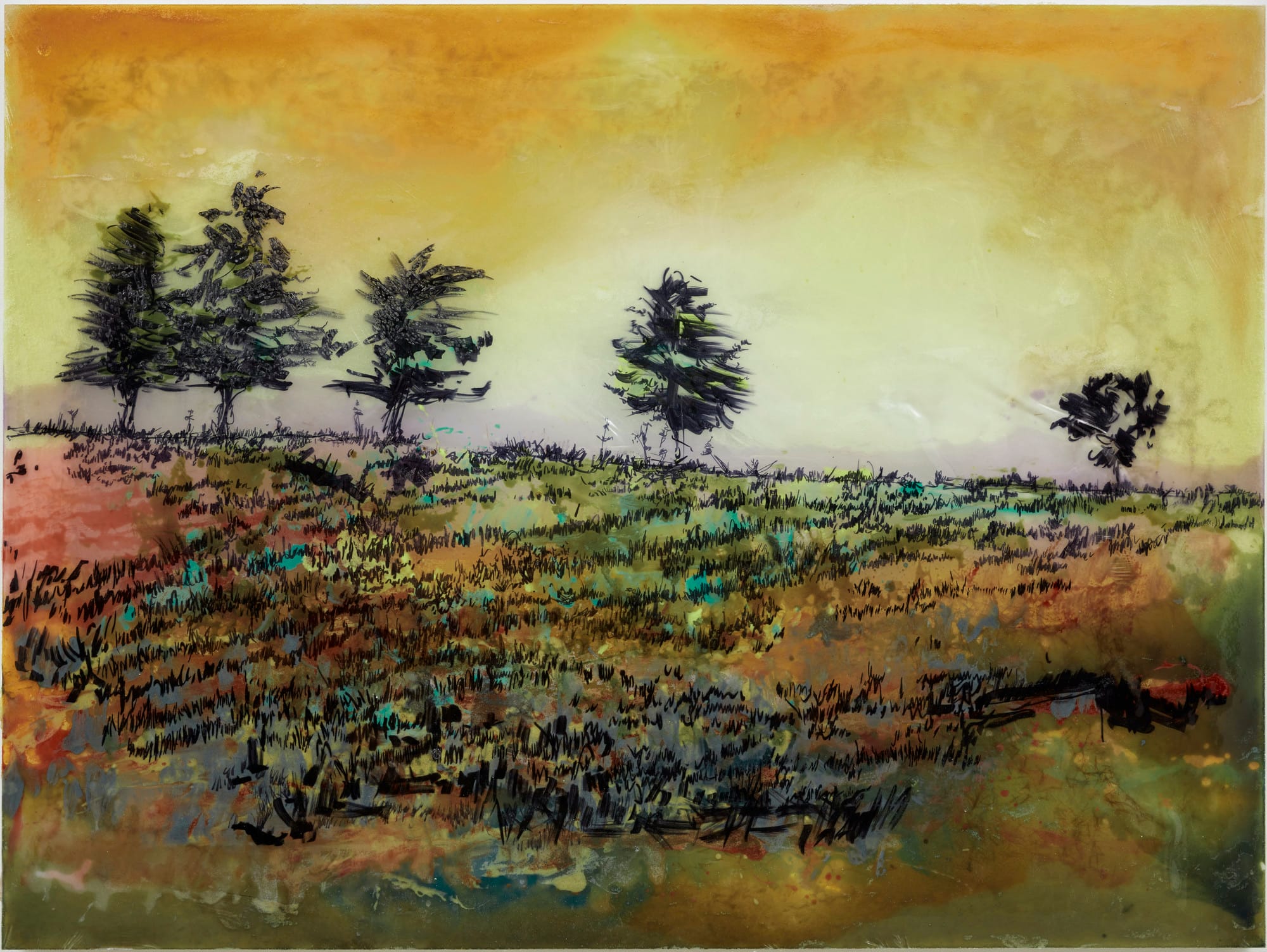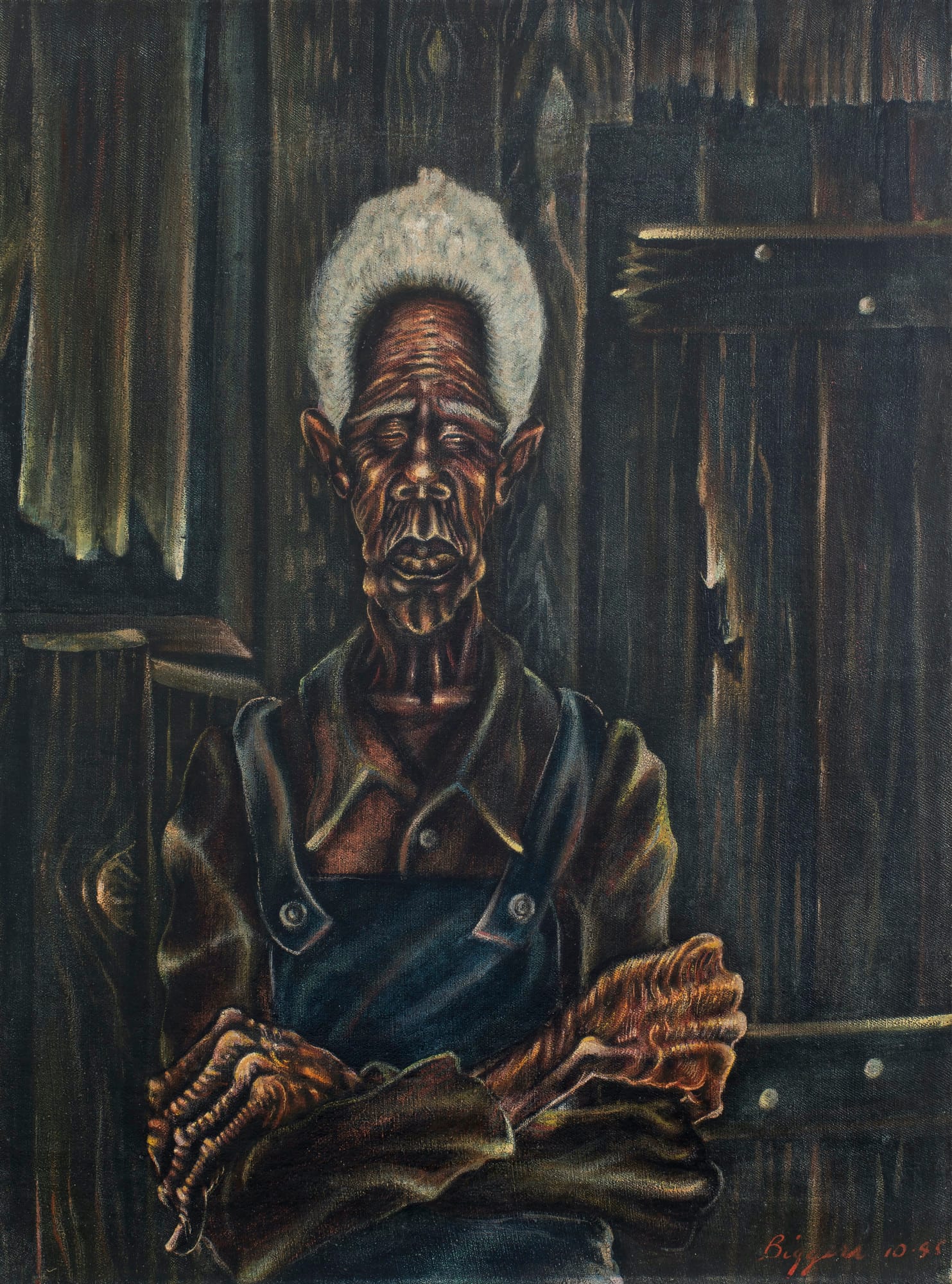 Born in 1931 into a lineage of sharecroppers in rural Texas at the height of the Great Depression, Ailey was raised by his mother after his father abandoned them. Constantly searching for work, she moved them from town to town; at one point, when Ailey was just five, he helped her pick cotton. This upbringing, steeped in the struggles of Southern Black life and the spiritual grounding of the church, profoundly shaped his most iconic work, Revelations. Drawing from the gospel, blues, and spirituality that surrounded him as a child, he transformed these memories into a montage of pain, hope, and redemption. Works like John Bigger’s portrait of a weary yet resilient Black man, “Sharecropper” (1945), characterized by its dark and somber tones, or “Haze” (2023), Kevin Beasley’s landscape painting of a few trees against a yellow sky in the South, depict histories that visually resonate with Ailey’s creations.