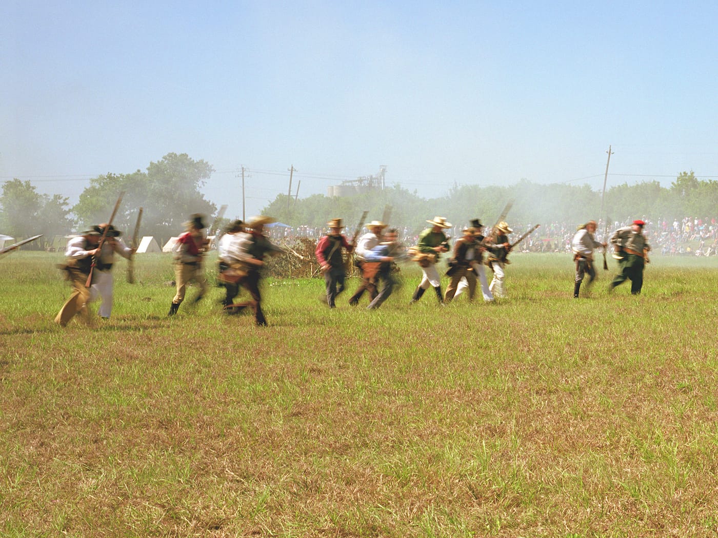 Reenactments are not simply tributes to nostalgia. In “Decisive Battle at San Jacinto” (2017), blurred bodies emerge like time travelers from a cloud of gun smoke. Civilian clothes hint that the men belong to a militia, charging toward an unseen threat out of frame. Long rifles point to the sky like lances, directing the eye to the distant white A-frame military tents, opposite an audience in colorful summer clothes. Distant telephone wires trace a second horizon. The visible speed of the modern militia men presumably matched the speed of the 1836 Battle of San Jacinto, which was over in less than 20 minutes. Although not as famous as the Alamo in the Texas Revolution, when Texans organized a rebellion against the Mexican government, San Jacinto was the final confrontation that ended the war. Generating collective memory through the complex language of performance can restore local history forgotten in the national memory. At the same time, it exposes the malleability of history and heritage.