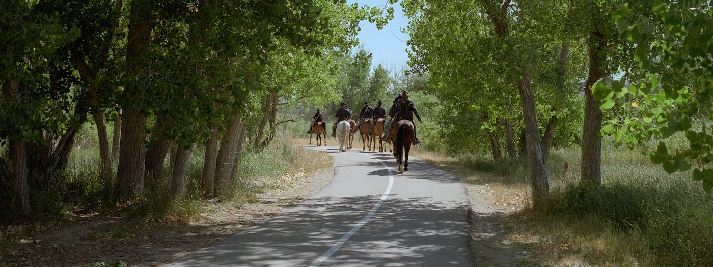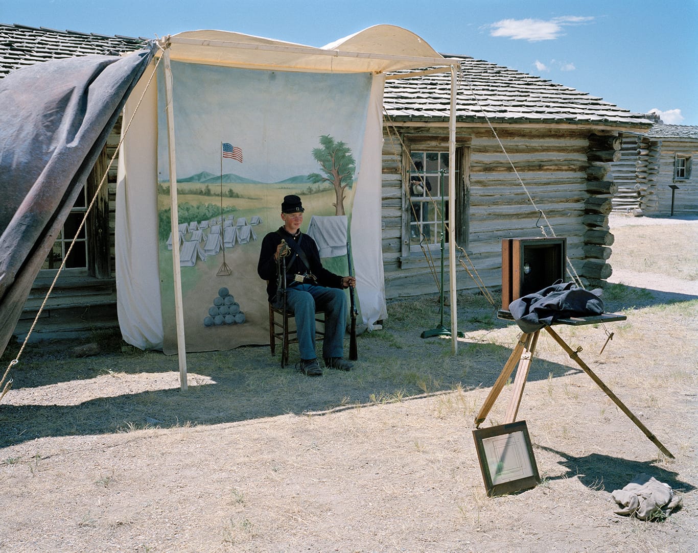 In “July Offensive on the North Platte” (2017), an iconic cavalry line echoes “Ray’s Troops” (1903) by Frederic Remington. In Winograde’s version the horses travel a paved park path, carefully staying right of the solid white line. The trees that frame their trajectory are protected by wire fencing. Everything is in its place. Everything tamed. The simulacrum of authenticity is a nostalgic stutter, according to author Katie Kitamura in her essay “Recreating Chaos,” providing access to the inaccessible and controlling something chaotic. Visuals of The West are so encoded in American culture that Winograde’s photos possess a déjà vu quality. Like the survey photography exemplified by Timothy O’Sullivan, which inspired great painters like Thomas Moran, and the film directors who borrowed their characters and boundless spaces, the Place and Time series implicates American culture as a centuries-long reenactment.